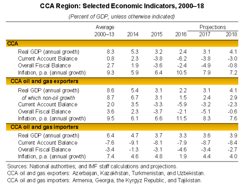 The improvement relative to October also reflected significant revisions to economic activity in Kazakhstan due to the impact of currency adjustment, lagged effects of earlier fiscal stimulus, and oil production from the new Kashagan field. With the slightly more benign external conditions anticipated to continue, growth in the CCA is projected to pick up to 3.1 percent in 2017 and further accelerate to 4.1 percent in 2018.