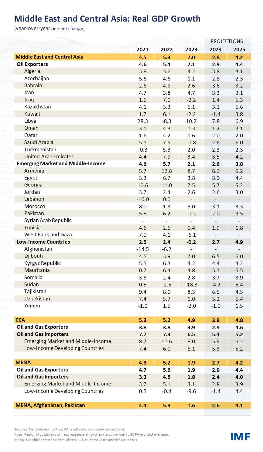The Middle East and North Africa and the Caucasus and Central Asia regions are positively impacted by the resilience of the global economy. Lower global commodity prices and vigilant policy responses have helped ease inflation in most countries. However, uncertainty and risks have risen amid ongoing conflicts, shipping disruptions, and reduced oil production. This is leading to an uneven recovery across the Middle East and Central Asia, with growth rates varying this year.