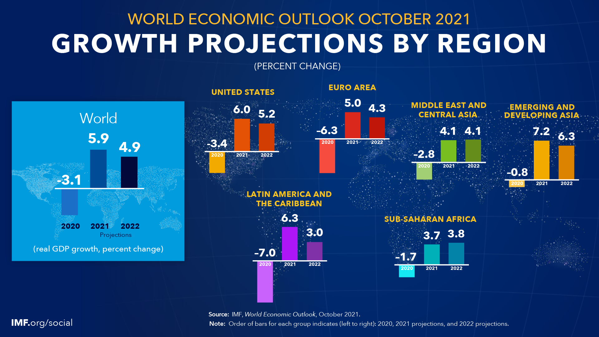 The global economy is projected to grow 5.9 percent in 2021 and 4.9 percent in 2022, 0.1 percentage point lower for 2021 than in the July forecast. The downward revision for 2021 reflects a downgrade for advanced economies—in part due to supply disruptions—and for low-income developing countries, largely due to worsening pandemic dynamics. This is partially offset by stronger near-term prospects among some commodity-exporting emerging market and developing economies. Rapid spread of Delta and the threat of new variants have increased uncertainty about how quickly the pandemic can be overcome. Policy choices have become more difficult, with limited room to maneuver.