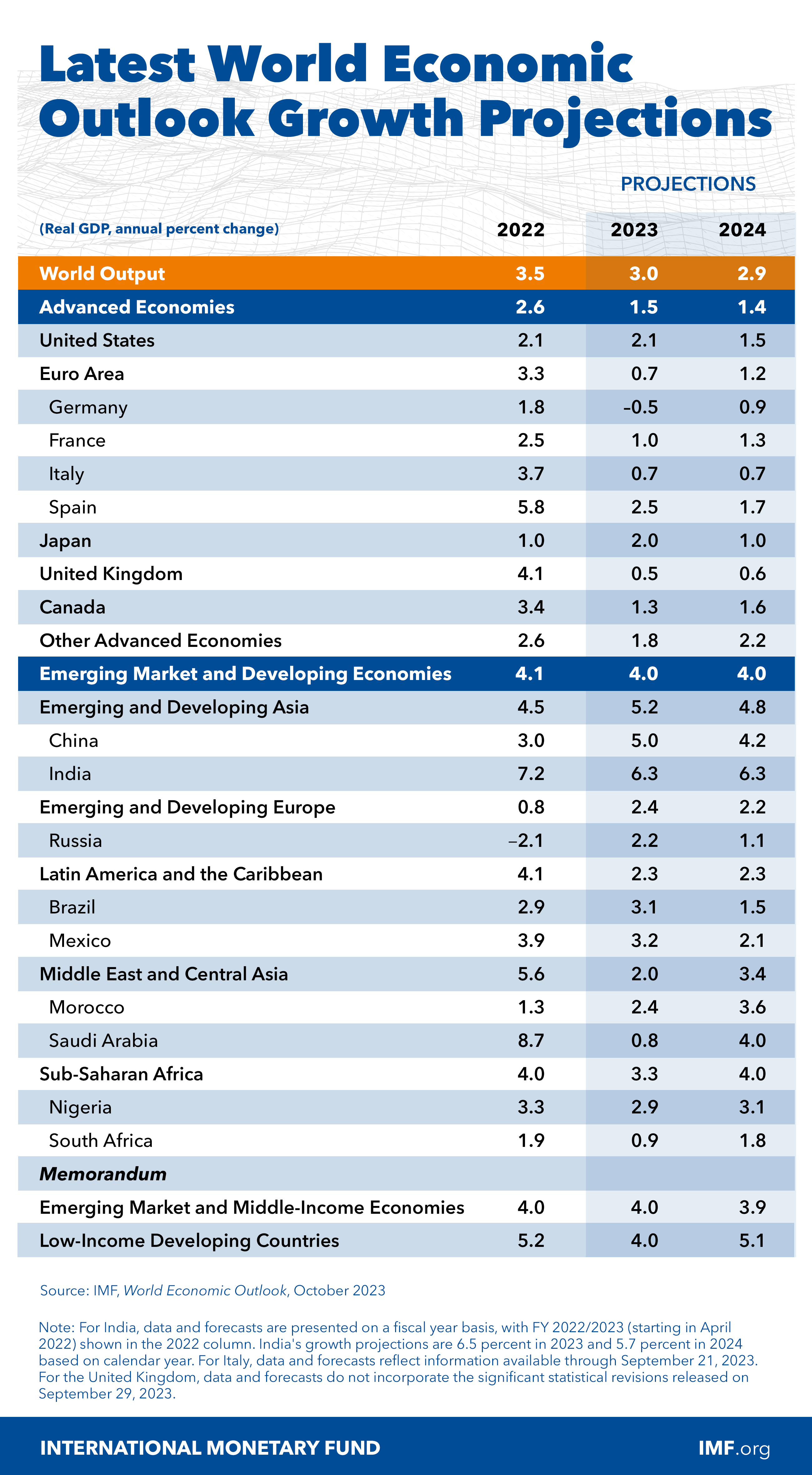 The baseline forecast is for global growth to slow from 3.5 percent in 2022 to 3.0 percent in 2023 and 2.9 percent in 2024, well below the historical (2000–19) average of 3.8 percent. Advanced economies are expected to slow from 2.6 percent in 2022 to 1.5 percent in 2023 and 1.4 percent in 2024 as policy tightening starts to bite. Emerging market and developing economies are projected to have a modest decline in growth from 4.1 percent in 2022 to 4.0 percent in both 2023 and 2024. Global inflation is forecast to decline steadily, from 8.7 percent in 2022 to 6.9 percent in 2023 and 5.8 percent in 2024, due to tighter monetary policy aided by lower international commodity prices. Core inflation is generally projected to decline more gradually, and inflation is not expected to return to target until 2025 in most cases.