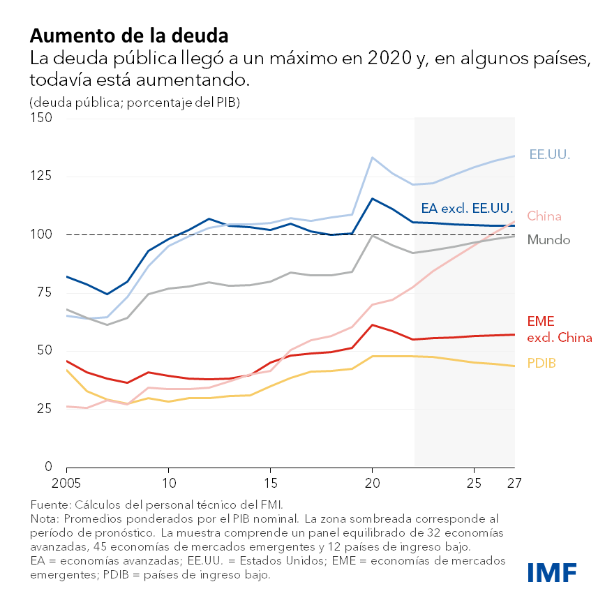La deuda pública aumentó hasta niveles históricos durante la pandemia, superando el producto interno bruto mundial. Ahora, con la deuda pública aún elevada, el aumento de las tasas de interés y la fortaleza del dólar de EE.UU. se han sumado a los costos por intereses, lo que a su vez lastra el crecimiento y alimenta los riesgos para la estabilidad financiera.