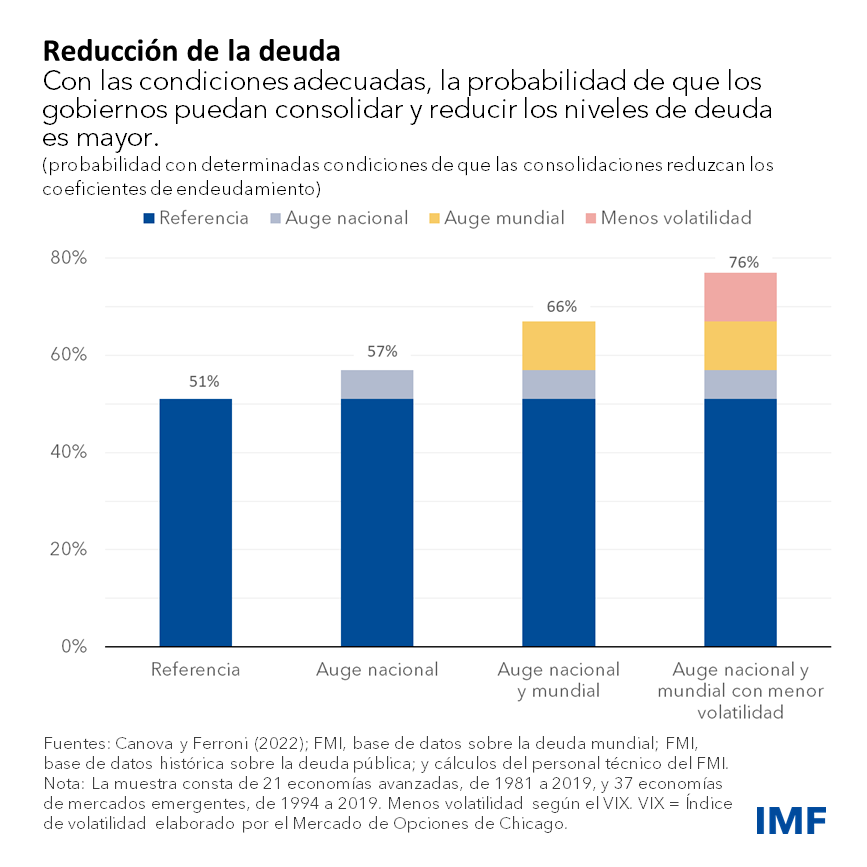 No obstante, el momento en que se realiza ajuste puede influir sobre su efecto. La probabilidad de reducir los coeficientes de endeudamiento mediante una consolidación mejora en aproximadamente la mitad a una tercera parte, respecto al escenario base (en promedio), cuando se lleva a cabo durante un período de auge nacional y mundial, o durante períodos en los que las condiciones financieras son laxas y la incertidumbre es baja.
