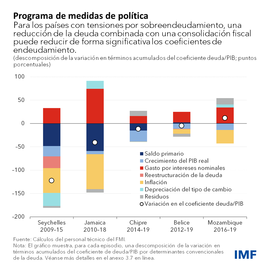 Los países que afrontan crecientes presiones de financiamiento o que ya tienen tensiones por sobreendeudamiento quizá no tengan una alternativa viable a la reducción sustancial o rápida de la deuda. Probablemente estos países necesitarán una consolidación fiscal para recobrar la confianza del mercado y recuperar la estabilidad macroeconómica. Además, las autoridades también deben considerar la posibilidad de reestructurar la deuda de manera oportuna. La reestructuración, si se realiza, tendrá que ser profunda para reducir los coeficientes de endeudamiento.