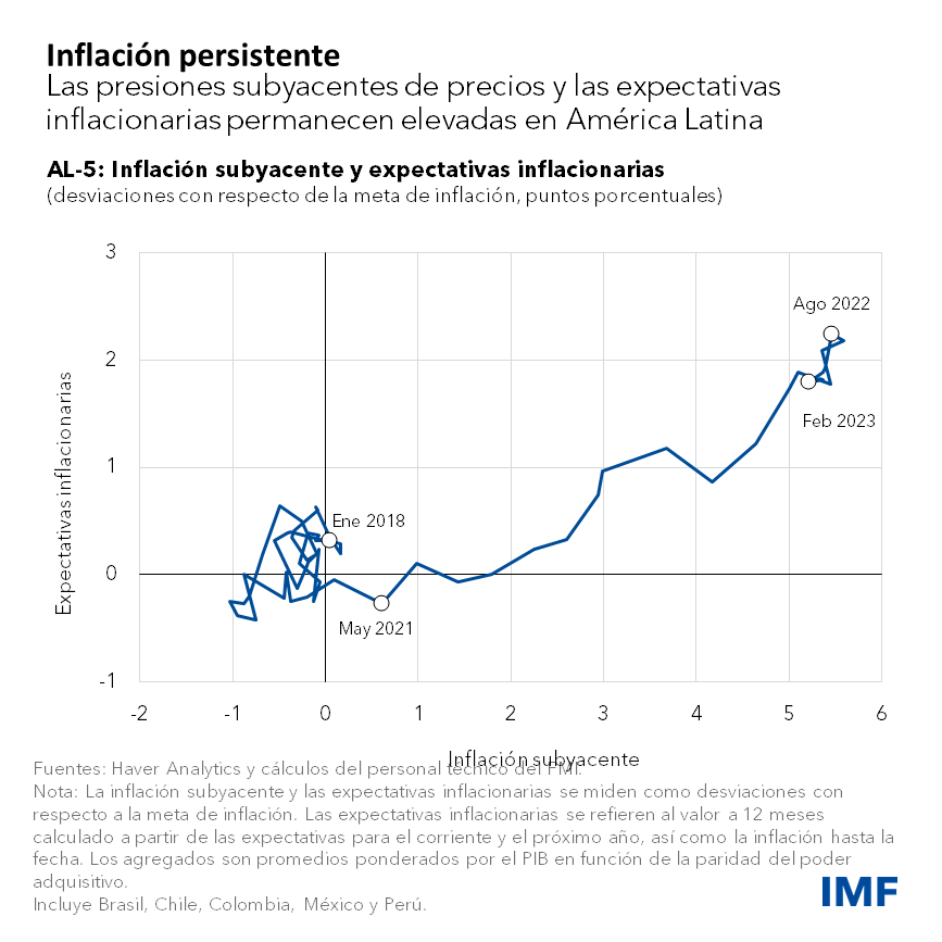 Tras alcanzar un máximo de 10% a mediados de 2022, la inflación general en las principales economías latinoamericanas se ha desacelerado a 7% en marzo. Pero este descenso obedece principalmente a la disminución de los precios de las materias primas desde sus niveles máximos. Mientras tanto, el progreso en la reducción de la inflación subyacente —que excluye alimentos y energía— parece haberse estancado. La demanda laboral es muy fuerte, y el empleo se mantiene firme por encima de los niveles anteriores a la pandemia. Al mismo tiempo, el producto se encuentra en su nivel potencial o por encima de este, y las expectativas de inflación a corto plazo superan los rangos fijados como meta por los bancos centrales. La fuerte demanda interna, el rápido aumento de los salarios y las presiones de precios generalizadas dejan entrever el riesgo de que la inflación se mantenga en niveles inaceptablemente elevados en la región.