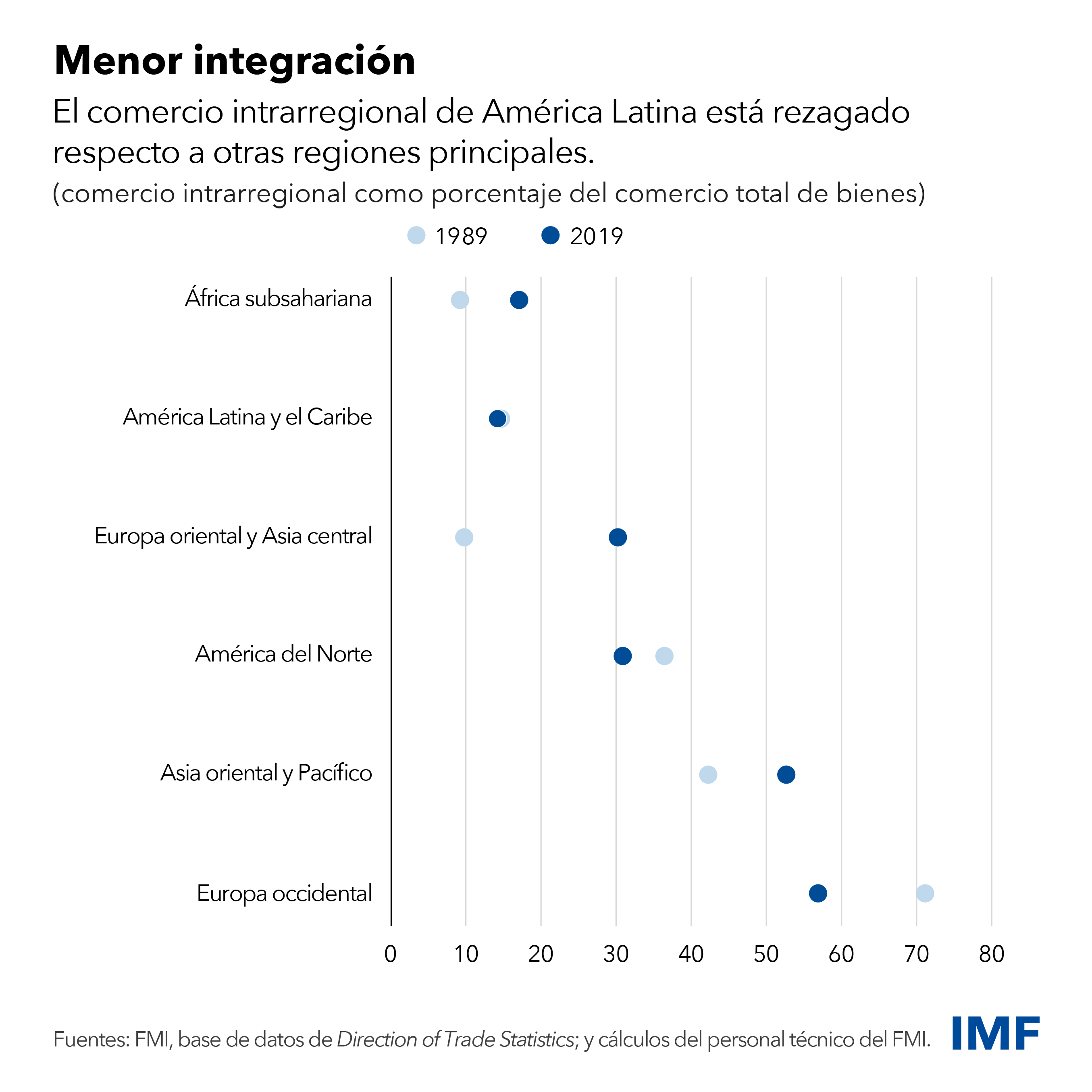 El comercio entre los países de la región también está rezagado y se ha mantenido prácticamente sin cambios por debajo de 20% del comercio total de América Latina. Esto equivale a menos de la mitad del nivel de comercio intrarregional de Europa oriental y Asia central, y un tercio del de Asia oriental. La participación de América Latina en las cadenas de valor mundiales es igualmente limitada. Esto se debe a que muchos países están más centrados en la exportación de materias primas que en la de bienes intermedios o finales, aunque la economía mexicana, mucho más integrada, constituye una excepción digna de mención, principalmente debido a sus estrechos vínculos con Estados Unidos.