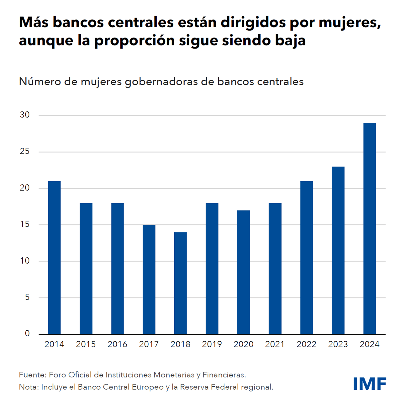 El número de mujeres gobernadoras ha aumentado a 29 este año, desde 23 el año pasado, aunque esto ha dejado la proporción de mujeres líderes en solo el 16% de los 185 bancos centrales del mundo, según un informe de abril del Foro Oficial de Instituciones Monetarias y Financieras (OMFIF). Un mayor equilibrio de género en los cargos directivos puede ayudar a aumentar la diversidad de ideas, así como los contrapesos y salvaguardias, lo que a su vez contribuye a una mayor estabilidad económica y financiera y a un mejor desempeño, según un estudio del FMI.