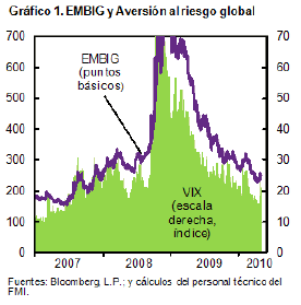 • La aversión global al riesgo. Un indicador del apetito global por activos de riesgo usado frecuentemente es el VIX. Este indicador financiero de mercado tiene mucho que decir sobre lo que acontece con el costo de financiamiento de economías de mercados emergentes, tal como se observa en su relación cercana con los diferenciales de riesgos de bonos soberanos (Gráfico 1).