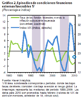 Cuando estos dos indicadores se encuentran en el lado bajo de su distribución—como sucedió en un número de años en los noventas, y luego durante 2004-07—decimos que las condiciones financieras son favorables (Gráfico 2).
