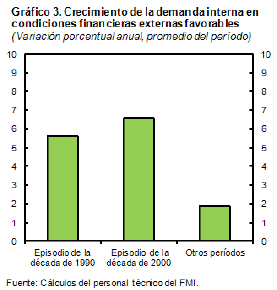 Entre los resultados empíricos se encuentra el que la demanda interna tiende a ser estimulada por bajas tasas de interés externa y también por bajos niveles del VIX—pero estos efectos han sido más grandes en América Latina que en el grupo de control en economías avanzadas. Esta respuesta de la demanda viene principalmente del sector privado, pero los gobiernos de América Latina, a diferencia de aquellos en el grupo de economías avanzadas, tendieron a contribuir a ello al aumentar en cierta medida su propio gasto. El resultado ha sido que la demanda interna de América Latina ha tendido a crecer muy por encima de la tendencia en el producto durante episodios de condiciones financieras favorable (Gráfico 3).