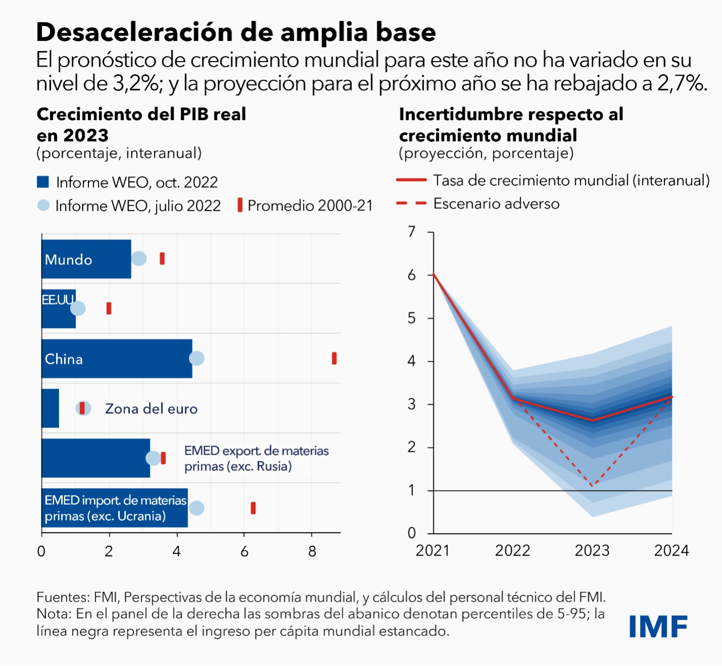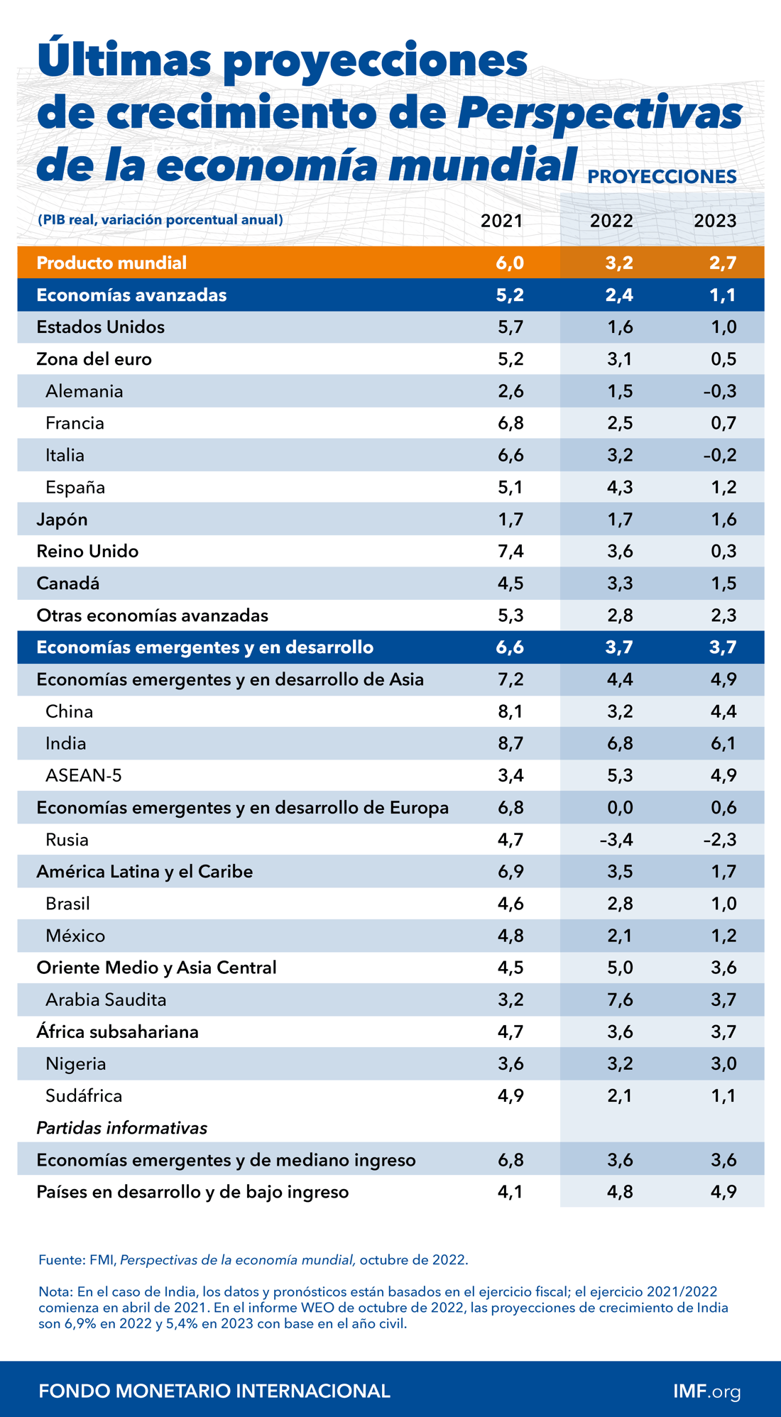 Nuestro pronóstico de crecimiento mundial para este año se mantiene en 3,2%, mientras que nuestra proyección para el próximo año ha disminuido a 2,7%, 0,2 puntos porcentuales inferior al pronóstico de julio. La desaceleración económica en 2023 será generalizada: varios países, que representan aproximadamente una tercera parte de la economía mundial, se encuentran a punto de contraerse este o el próximo año. Las tres principales economías —Estados Unidos, China y la zona del euro— continuarán estancadas. En general, los shocks de este año volverán a abrir heridas económicas que no se curaron por completo tras la pandemia. En pocas palabras, lo peor aún está por llegar, y para mucha gente 2023 se sentirá como un año de recesión.