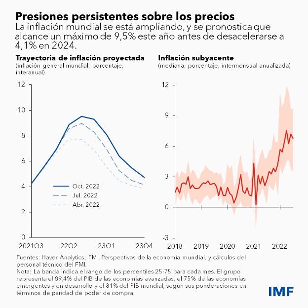 Pese a la desaceleración económica, las presiones inflacionarias están demostrando ser más extensas y persistentes de lo esperado. Ahora se prevé que la inflación mundial alcance un máximo de 9,5% este año, antes de desacelerarse a 4,1% en 2024. La inflación también se está extendiendo más allá de los alimentos y la energía. Para la mediana de los países, la inflación subyacente mundial aumentó desde una tasa mensual anualizada de 4,2% a finales de 2021 hasta 6,7% en julio de este año.
