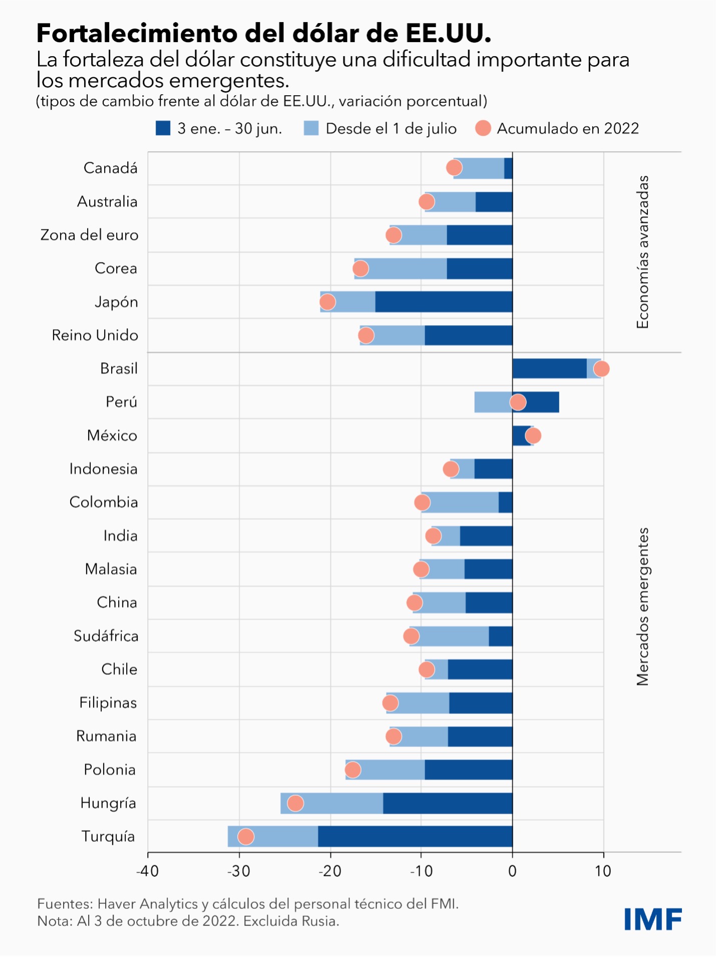 Para muchos mercados emergentes, la fortaleza del dólar constituye una dificultad importante. El dólar está ahora en su momento más fuerte desde comienzos de la década de 2000, aunque la apreciación es más pronunciada frente a las monedas de las economías avanzadas. Hasta el momento, este fortalecimiento parece obedecer sobre todo a fuerzas fundamentales, como el endurecimiento de la política monetaria en Estados Unidos y la crisis energética.