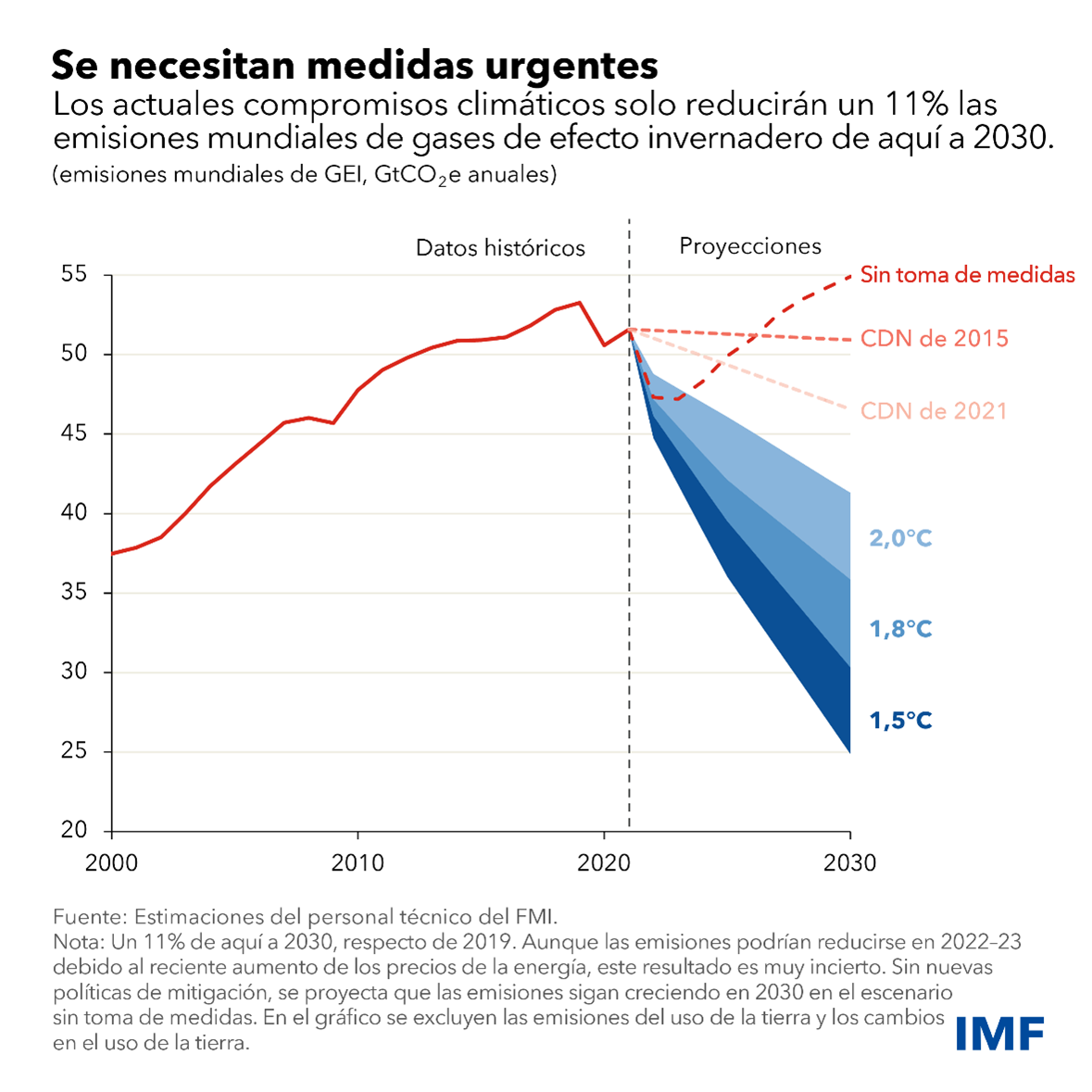 Y en el terreno de la política la brecha es incluso mayor. Un nuevo análisis del FMI de las políticas climáticas actuales a escala mundial muestra que solo lograrían una reducción del 11%. La diferencia entre esta cifra y lo que se necesita es enorme, equivalente a más de cinco veces las emisiones anuales actuales de la Unión Europea.