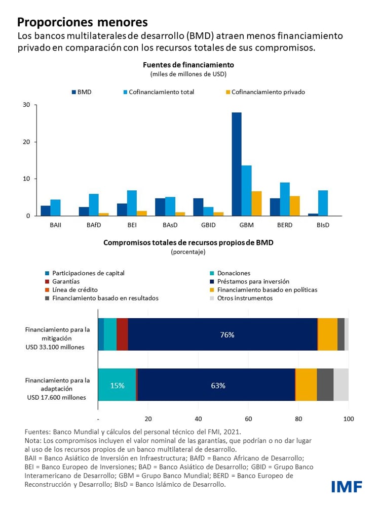 Los bancos de desarrollo, al estar de acuerdo en ser los primeros en sufrir pérdidas en titulizaciones y vehículos de financiamiento verde, pueden incrementar el beneficio esperado ajustado por el riesgo de los inversionistas privados. Con la gobernanza adecuada, el respaldo público puede contribuir a evitar el riesgo moral asociado con las garantías, que comporta el riesgo de que las ganancias se privaticen mientras que las pérdidas se socialicen. Las economías avanzadas podrían respaldar las participaciones públicas de capital como forma de cumplir su compromiso anual de USD 100.000 millones para las economías emergentes y en desarrollo.