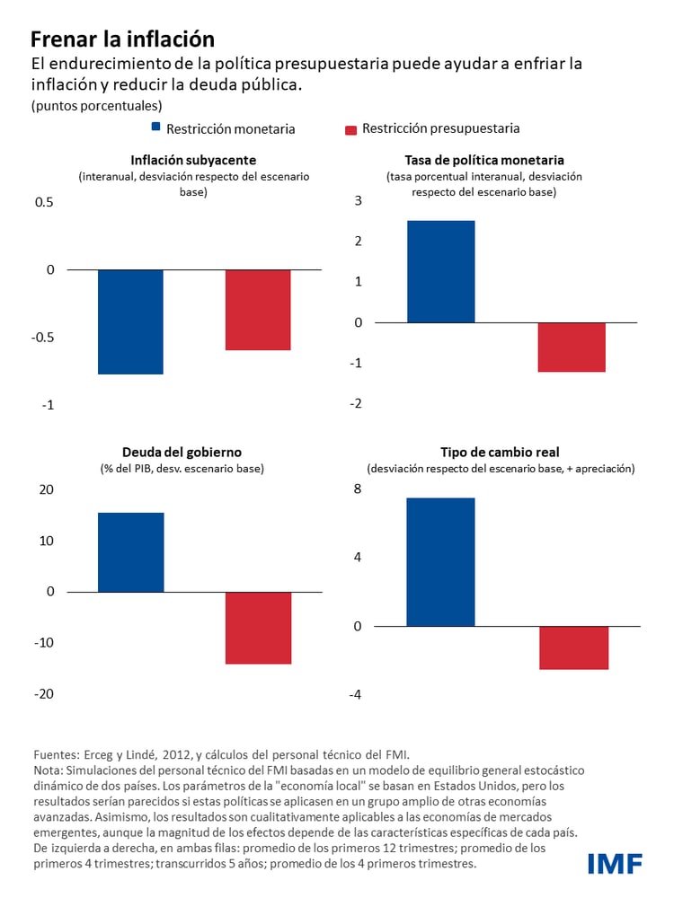 En el segundo método, el endurecimiento de la política presupuestaria enfría la demanda sin necesidad de aumentar las tasas de interés, de modo que el tipo de cambio real se deprecia. Además, la disminución de los costos del servicio de la deuda y la reducción de los déficits primarios provocan un descenso de la deuda pública. La apreciación del tipo de cambio real en un entorno de mayor austeridad monetaria hace que la inflación disminuya un poco más, pero esta diferencia se reduciría si un mayor número de países aplicasen estas políticas