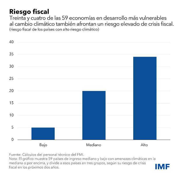 Los países más vulnerables al cambio climático —y a la pérdida asociada de biodiversidad natural— suelen ser los que menos pueden permitirse invertir en fortalecer la resiliencia, porque sus presupuestos están presionados por la deuda. Estos países afrontan un riesgo elevado de crisis fiscal, según un estudio del personal técnico del FMI.