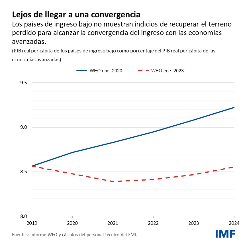 Hemos revisado a la baja nuestras proyecciones de crecimiento para los países de ingreso bajo, cuyas tasas de crecimiento del ingreso per cápita están cada vez más lejos de alcanzar a las economías avanzadas, lo que amenaza con invertir la tendencia de las últimas décadas de convergencia hacia mejores niveles de vida.