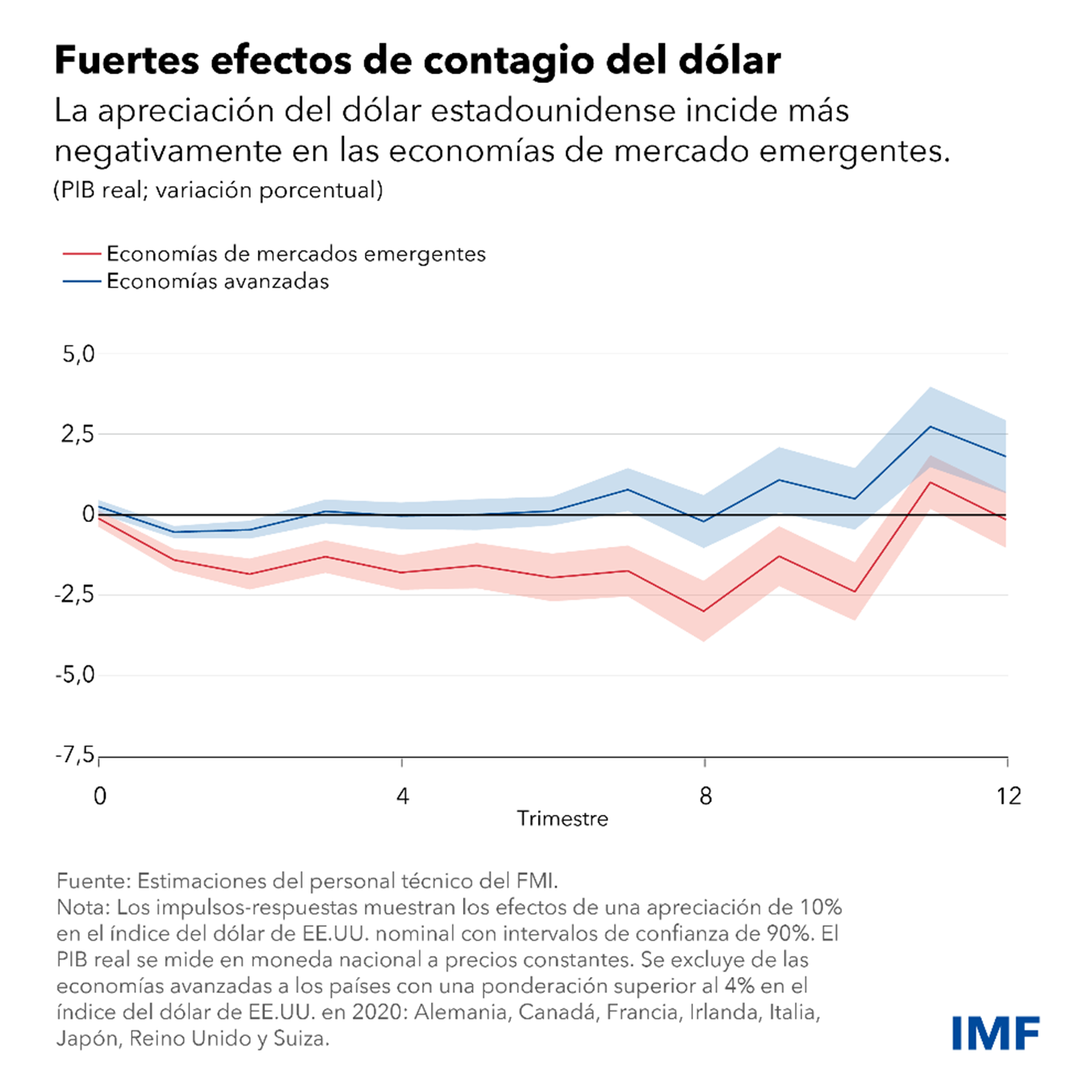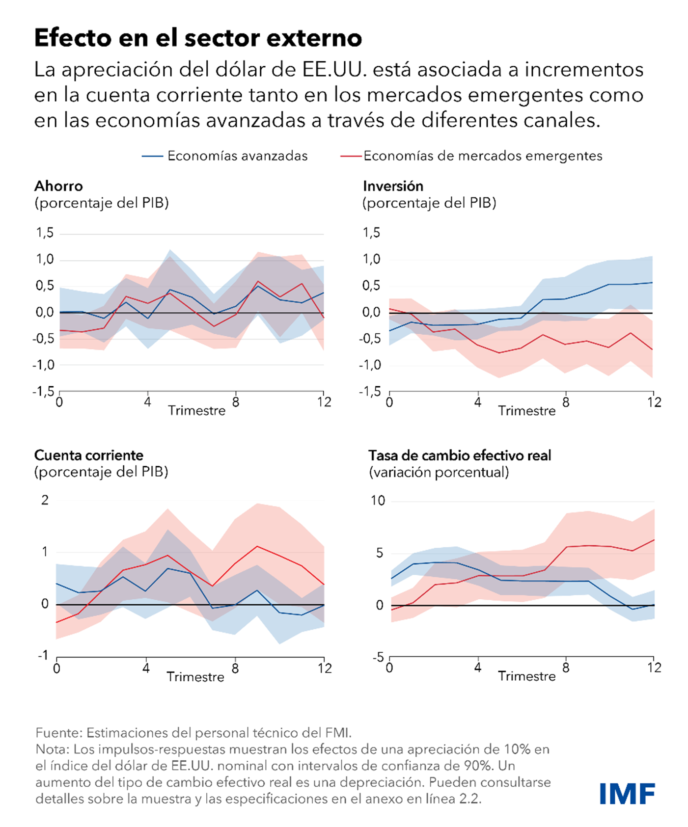 En las economías de mercados emergentes, una apreciación del dólar estadounidense de 10%, vinculada a las fuerzas del mercado financiero mundial, reduce el producto económico en 1,9% al cabo de un año, y ese lastre persiste durante dos años y medio. Por el contrario, los efectos negativos en las economías avanzadas son considerablemente menores: alcanzan un máximo de 0,6% al cabo de un trimestre y prácticamente se disipan al cabo de un año.