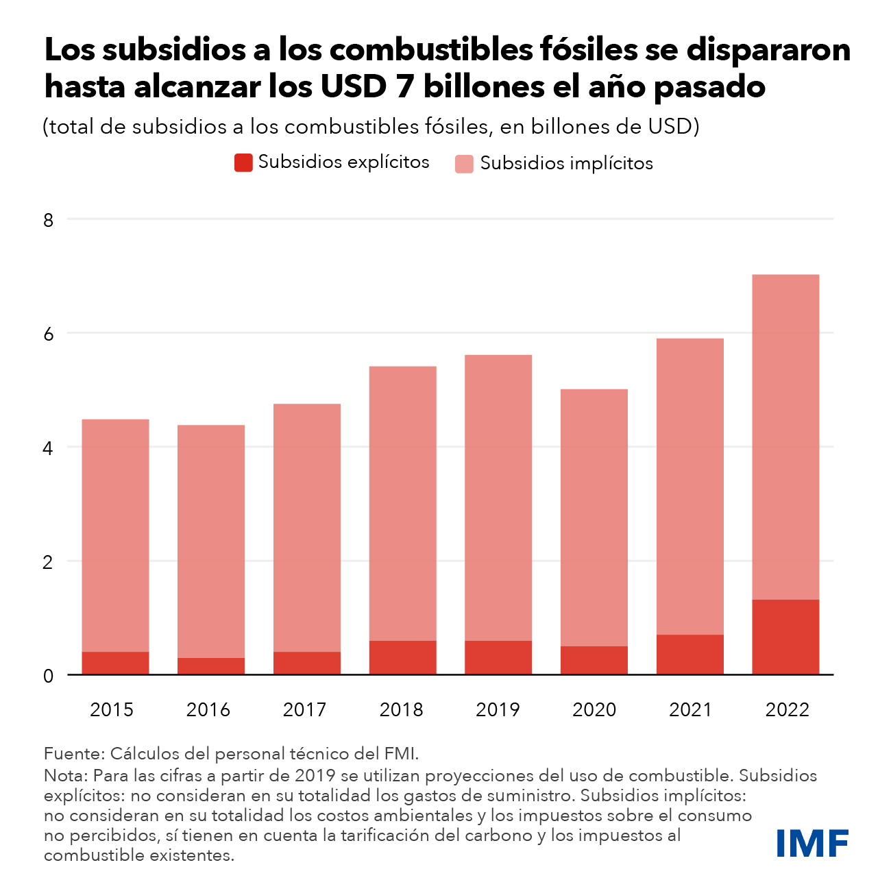 Los subsidios a los combustibles fósiles se dispararon hasta alcanzar un monto histórico de USD 7 billones el año pasado, cuando los gobiernos ayudaron a los consumidores y a las empresas durante la escalada mundial de los precios de la energía causada por la invasión rusa de Ucrania y la recuperación económica tras la pandemia.