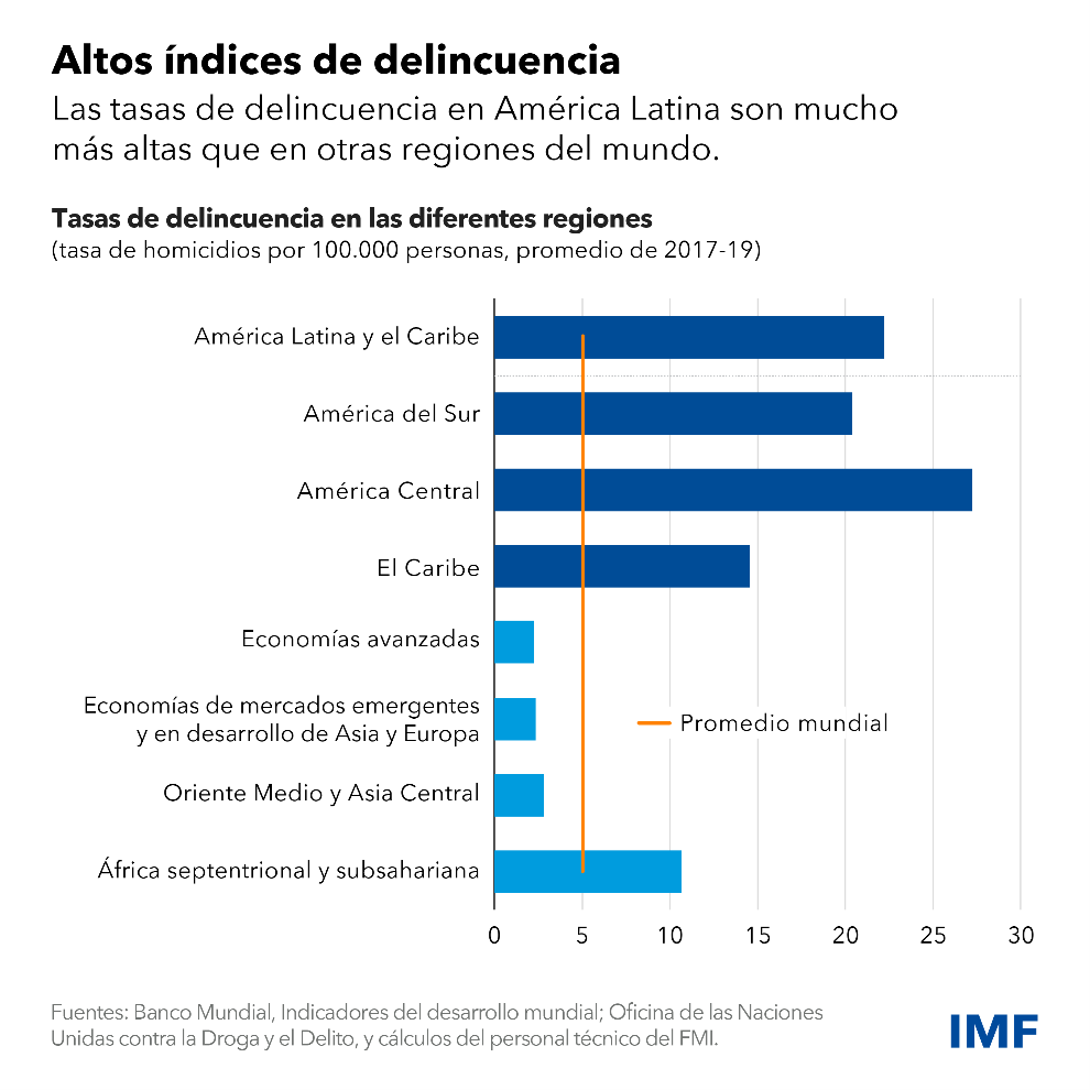 La tasa de homicidio media de la región es 10 veces superior a la de otras economías de mercados emergentes y en desarrollo y el doble que la de África subsahariana. En la región, América Central sobresale como la subregión más violenta. La inseguridad también ha empeorado con el transcurso del tiempo, sobre todo en ciertas partes de la región. Por ejemplo, América Central y el Caribe han registrado aumentos anuales de las tasas de homicidio de aproximadamente 4% en las últimas dos décadas.