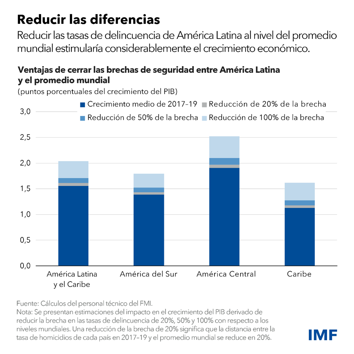 Reducir la violencia puede generar enormes beneficios. De acuerdo con el estudio, reducir el nivel de delincuencia en América Latina al nivel del promedio mundial incrementaría el crecimiento económico anual de la región en 0,5 puntos porcentuales, lo que equivale a aproximadamente un tercio del crecimiento registrado en América Latina entre 2017 y 2019. Además, hacer frente a la inseguridad donde sea más prevalente parece arrojar los mayores beneficios. Por ejemplo, cerrar por completo la brecha de delincuencia en los países con las tasas más altas de homicidios podría elevar su producto interno bruto en alrededor de 0,8 puntos porcentuales.