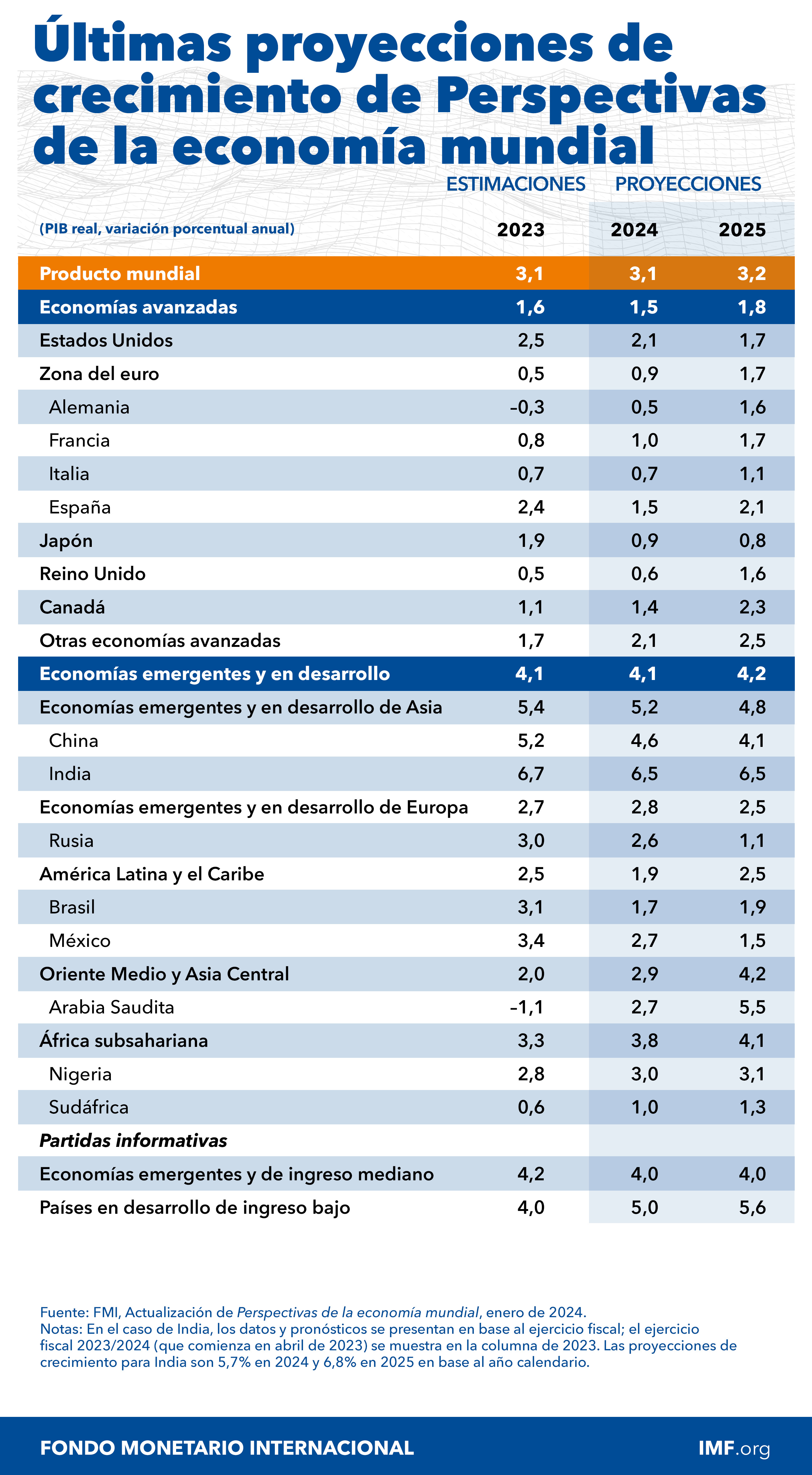Esta resiliencia continuará. Según nuestro pronóstico de base, el crecimiento mundial se estabilizará en 3,1% este año, con una mejora de 0,2 puntos porcentuales con respecto a las proyecciones de octubre, antes de incrementarse ligeramente a 3,2% el próximo año.