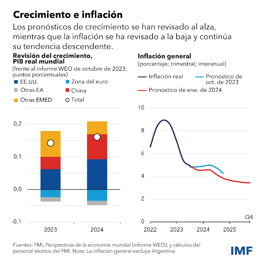 La inflación sigue disminuyendo. Exceptuando Argentina, el nivel general de inflación a escala mundial descenderá hasta 4,9% este año, lo que representa una reducción de 0,4 puntos porcentuales con respecto a la proyección de octubre (que también exceptuaba a Argentina). La inflación subyacente, excluidos los volátiles precios de los alimentos y la energía, también presenta una tendencia a la baja. En las economías avanzadas, la inflación general y subyacente promediará en torno a 2,6% este año, un valor cercano a las metas de inflación de los bancos centrales.