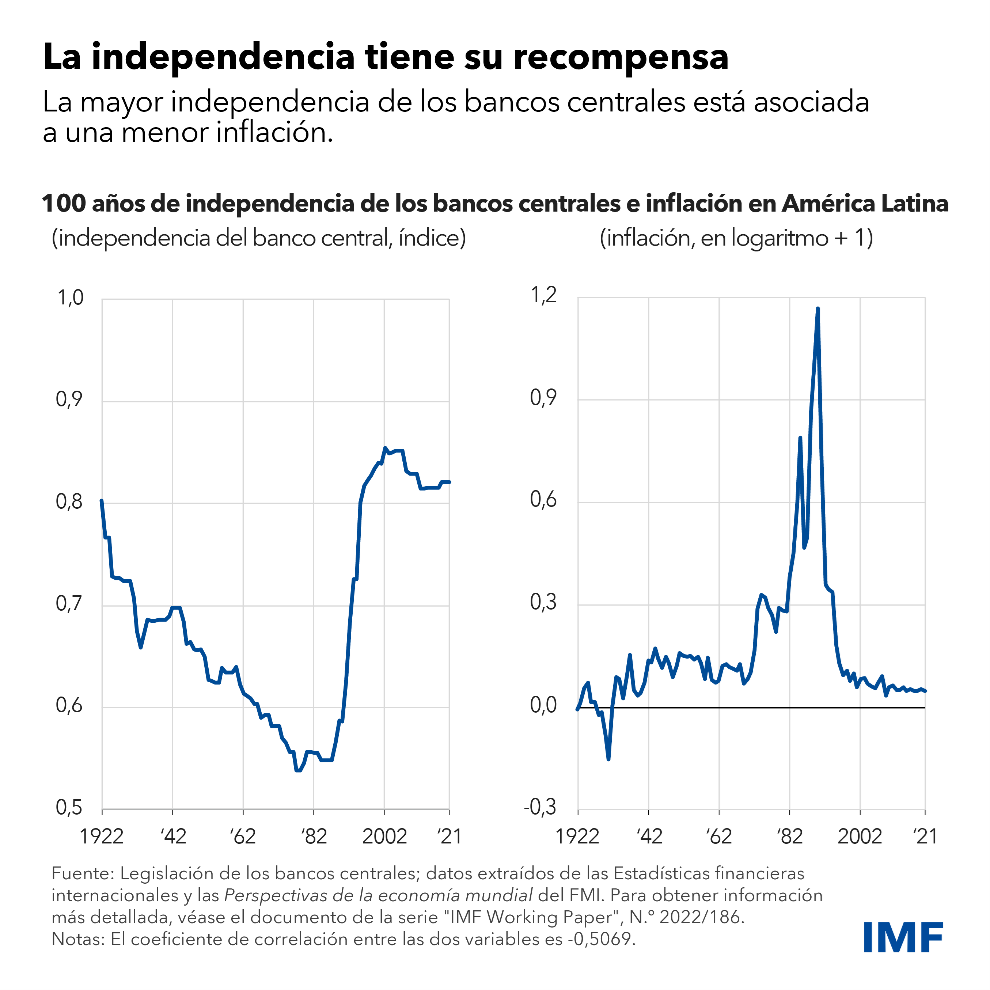 En otro estudio del FMI se hizo un seguimiento de 17 bancos centrales de América Latina a lo largo de los últimos 100 años y se examinaron una serie de factores como: la independencia en la toma de decisiones, la claridad del mandato y la existencia, o no, de la obligación de prestar dinero al gobierno. Este estudio también constató que una mayor independencia estaba asociada a resultados mucho mejores en términos de inflación.