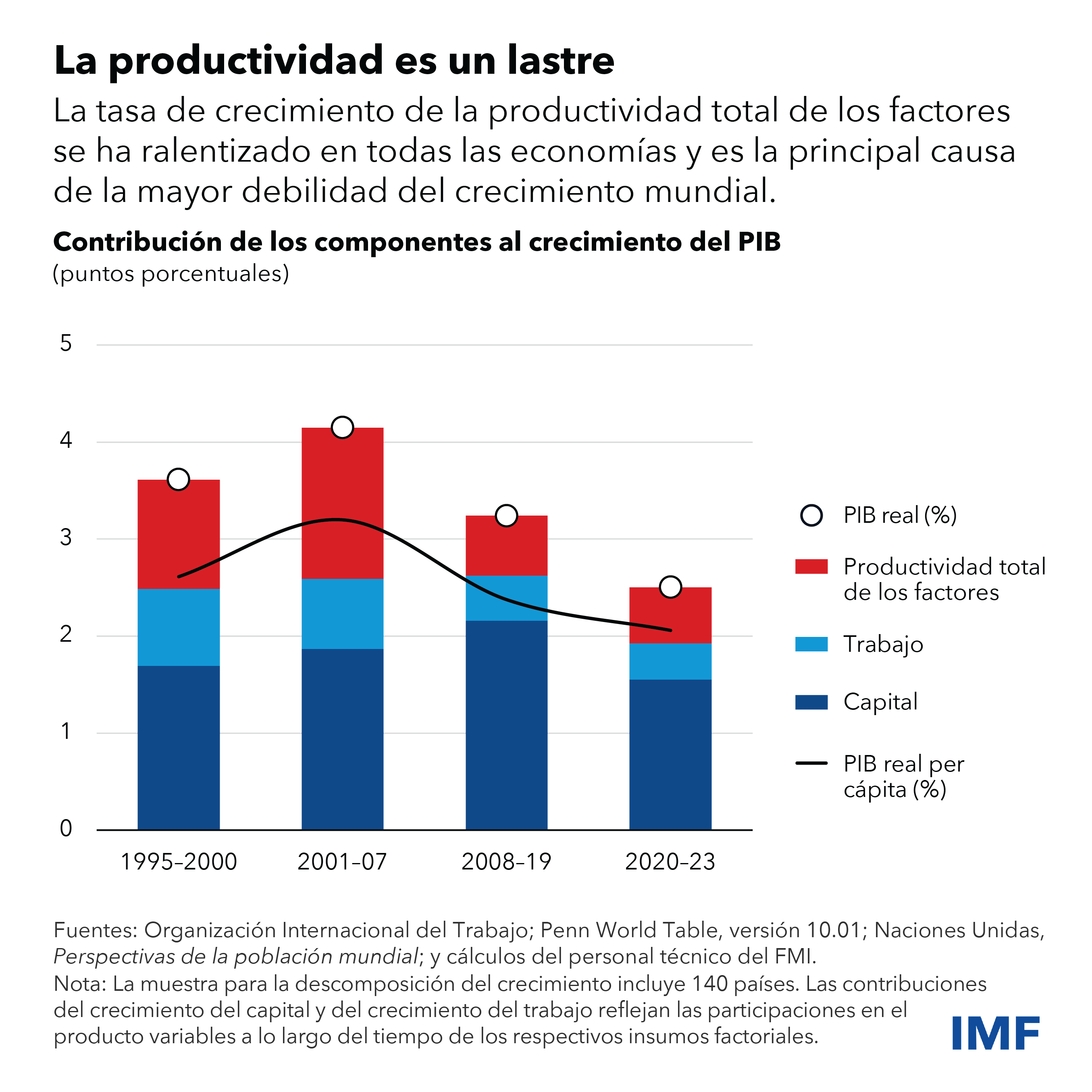 Las perspectivas de crecimiento a más largo plazo también han empeorado por la presencia de varios factores adversos. El crecimiento mundial se ralentizará hasta poco más de 3% de aquí a 2029, según las proyecciones a cinco años de nuestro último informe Perspectivas de la economía mundial (informe WEO). Nuestro análisis [link] muestra que el crecimiento podría situarse al final de la década aproximadamente un punto porcentual por debajo del promedio del período previo a la pandemia (2000-2019). Esto echa por tierra las mejoras logradas en las condiciones de vida; además, las disparidades de la desaceleración entre las naciones más ricas y las más pobres podrían limitar las perspectivas de convergencia mundial de los niveles de ingreso.