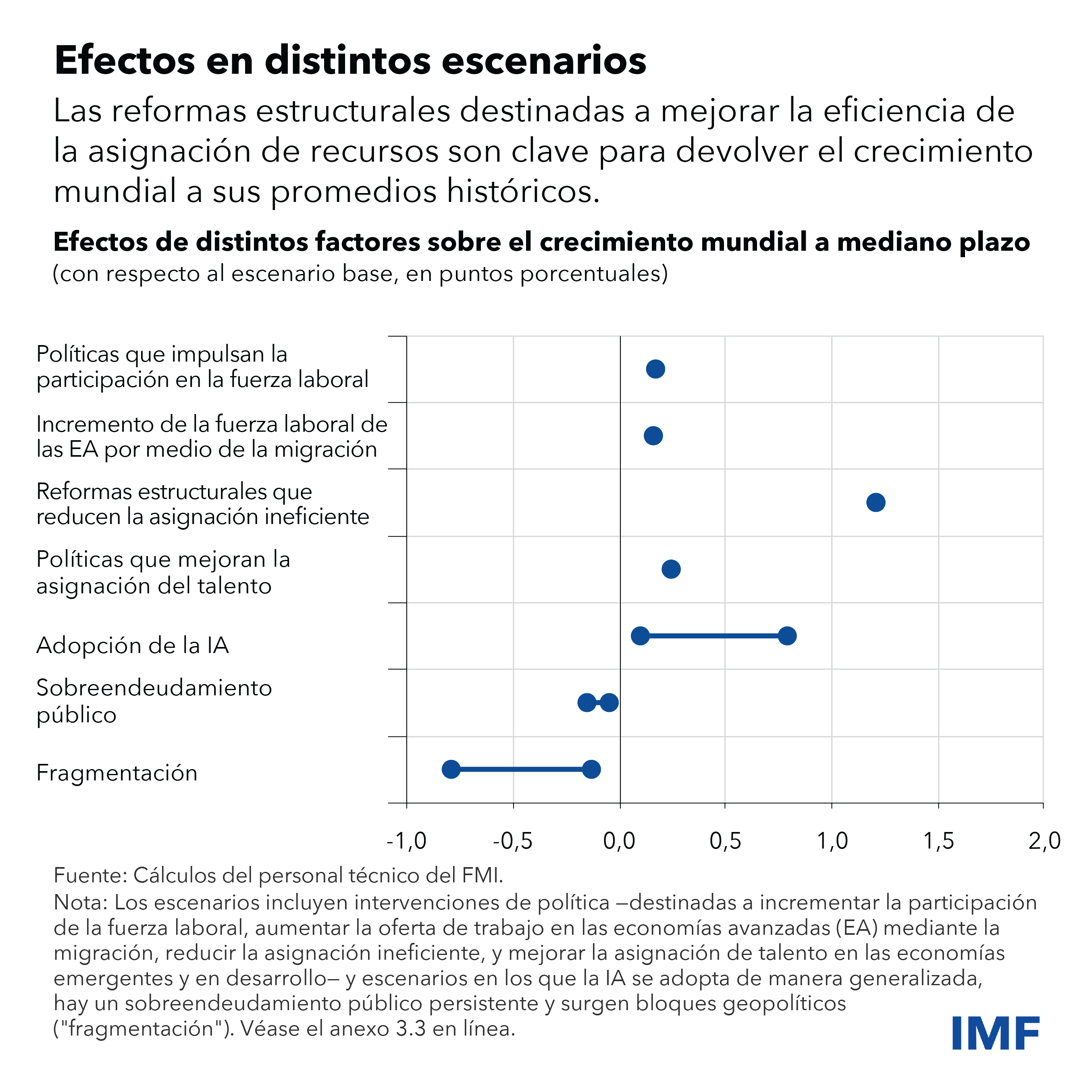 En cambio, las reformas que mejoran la productividad y aprovechan plenamente la inteligencia artificial (IA) son clave para reactivar el crecimiento en el mediano plazo. Nuestro análisis sugiere que medidas de políticas focalizadas en la mejora de la competencia de mercado, la apertura comercial, el acceso a servicios financieros y la flexibilidad del mercado de trabajo podrían elevar el crecimiento de la productividad en aproximadamente 1,2 puntos porcentuales de aquí a 2030. El potencial de la IA para impulsar la productividad del trabajo es incierto, pero también podría ser sustancial y aportar hasta 0,8 puntos porcentuales al crecimiento mundial, dependiendo de su adopción y su impacto en la fuerza laboral.