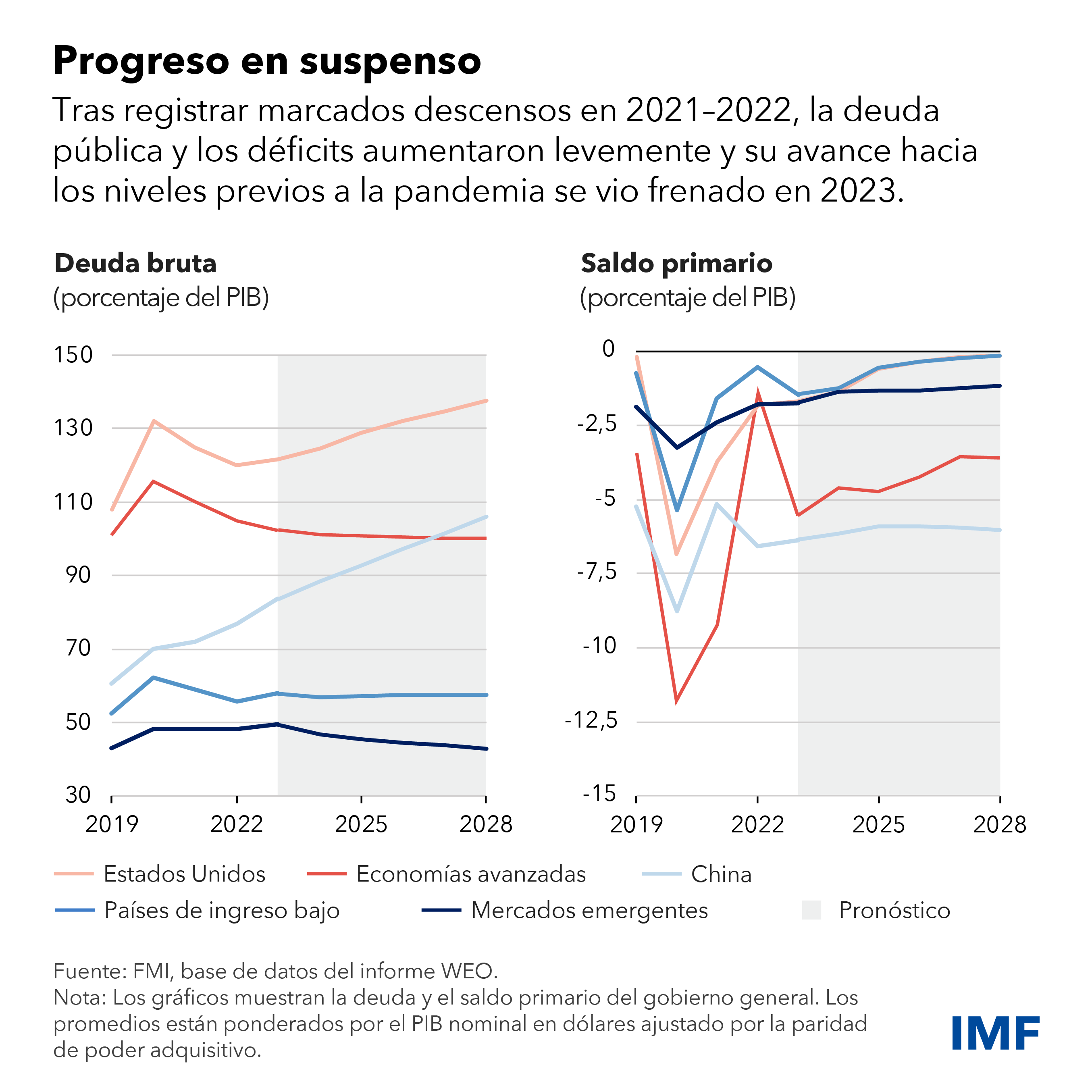 Cuatro años después del inicio de la pandemia, el gasto público, excluidos los pagos de intereses, sigue situándose aproximadamente 3 y 2 puntos porcentuales del producto interno bruto (PIB) por encima de las proyecciones previas a la pandemia en las economías avanzadas y las economías de mercados emergentes, respectivamente. Este nivel de gasto refleja el lento repliegue de las políticas fiscales de la era de crisis y la adopción de nuevas medidas de apoyo, junto con nuevas medidas de política industrial, que incluyen subsidios e incentivos tributarios. Las tasas de interés nominales más altas elevaron los pagos de intereses en la mayoría de los países.