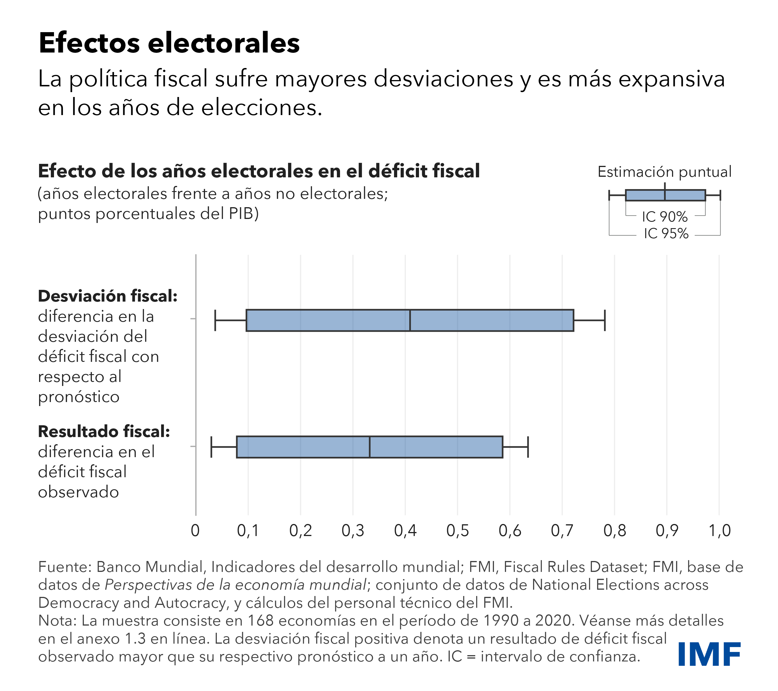 En 2024, un número sin precedente de países, en los que vive más de la mitad de la población mundial, celebran elecciones nacionales. Históricamente, los gobiernos tienden a gastar más y gravar menos en años electorales. Los déficits en los años de elecciones tienden a superar los pronósticos en 0,4 puntos porcentuales del PIB en comparación con los años en que no se celebran elecciones. En este año de gran cantidad de elecciones, los gobiernos han de ejercer austeridad fiscal para preservar la solidez de las finanzas públicas.