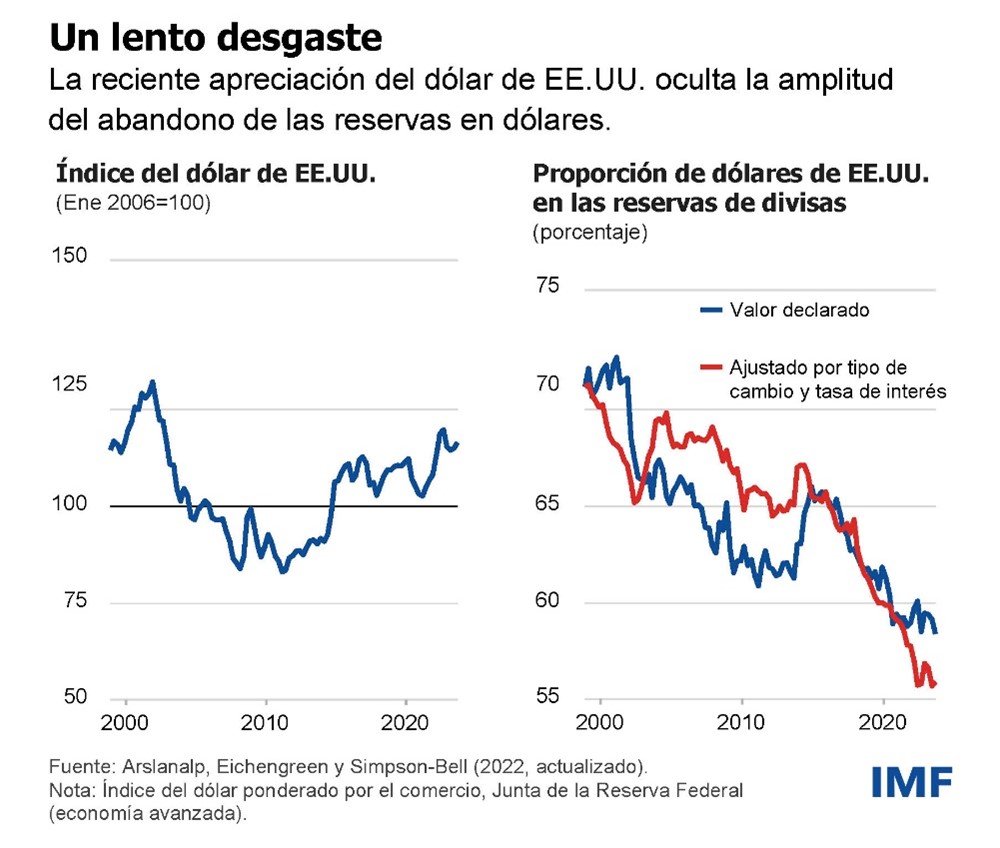 El predominio del dólar de EE.UU., es decir, su enorme papel en la economía mundial, ha cobrado especial relevancia en tiempos recientes debido a la apreciación del billete verde, a la que han contribuido la solidez de la economía estadounidense, la contracción de la política monetaria y el aumento del riesgo geopolítico. A la vez, la fragmentación económica y la posible reorganización de la actividad económica y financiera mundial en bloques separados y no superpuestos podrían incentivar a algunos países a recurrir a otras monedas internacionales y de reserva.