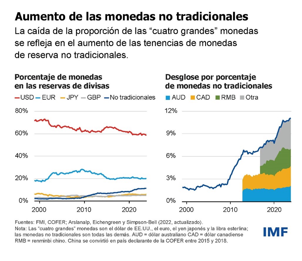 Según datos recientes del FMI de la encuesta sobre la composición de las reservas oficiales de divisas (COFER), se está produciendo una reducción gradual de la proporción del dólar en las reservas de divisas de bancos centrales y gobiernos. Sorprendentemente, la reducción del papel del dólar de EE.UU. en las dos últimas décadas no se ha visto acompañada de un aumento de la proporción de las otras tres de las “cuatro grandes” monedas, a saber, el euro, el yen y la libra esterlina. Más bien ha ido acompañado de un aumento de la proporción de lo que hemos denominado monedas de reserva no tradicionales, entre las que se incluyen el dólar australiano, el dólar canadiense, el renminbi chino, el won surcoreano, el dólar singapurense y las monedas nórdicas. Los datos más recientes amplían esa tendencia, que ya habíamos señalado en un documento de trabajo del FMI y en un blog.