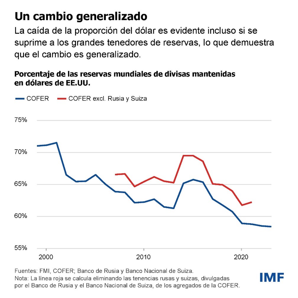 Al mismo tiempo, las pruebas estadísticas no apuntan a una aceleración en la disminución de la proporción de reservas en dólares, en contra de la afirmación de que las sanciones financieras estadounidenses han acelerado el alejamiento del billete verde. Sin duda es posible, como sostienen algunos, que los países que están tratando de alejarse de las tenencias de dólares por razones geopolíticas no informen a la COFER de la composición de sus carteras de reservas. Cabe señalar, no obstante, que las 149 economías participan en COFER representan nada menos que el 93% de las reservas mundiales de divisas, lo que significa que los países que no participan tienen apenas una pequeña proporción de las reservas mundiales.