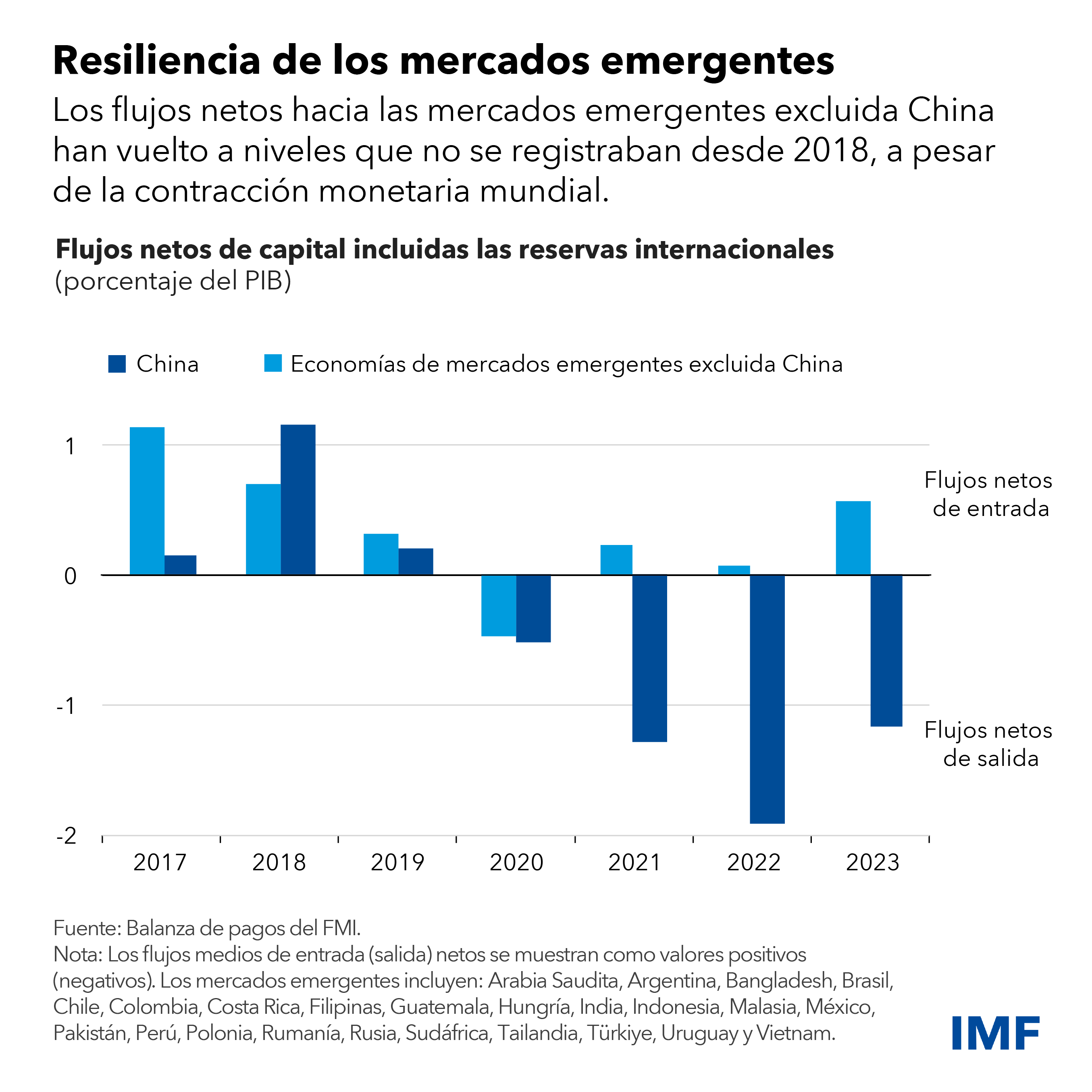 Nuestro último informe sobre el sector externo muestra que los flujos de capitales hacia los mercados emergentes se han recuperado tras registrar niveles muy bajos después de la pandemia. El año pasado, las entradas netas de capitales en los mercados emergentes —excluida China— aumentaron hasta situarse en USD 110.000 millones o el 0,6% del PIB, el nivel más alto registrado desde 2018.