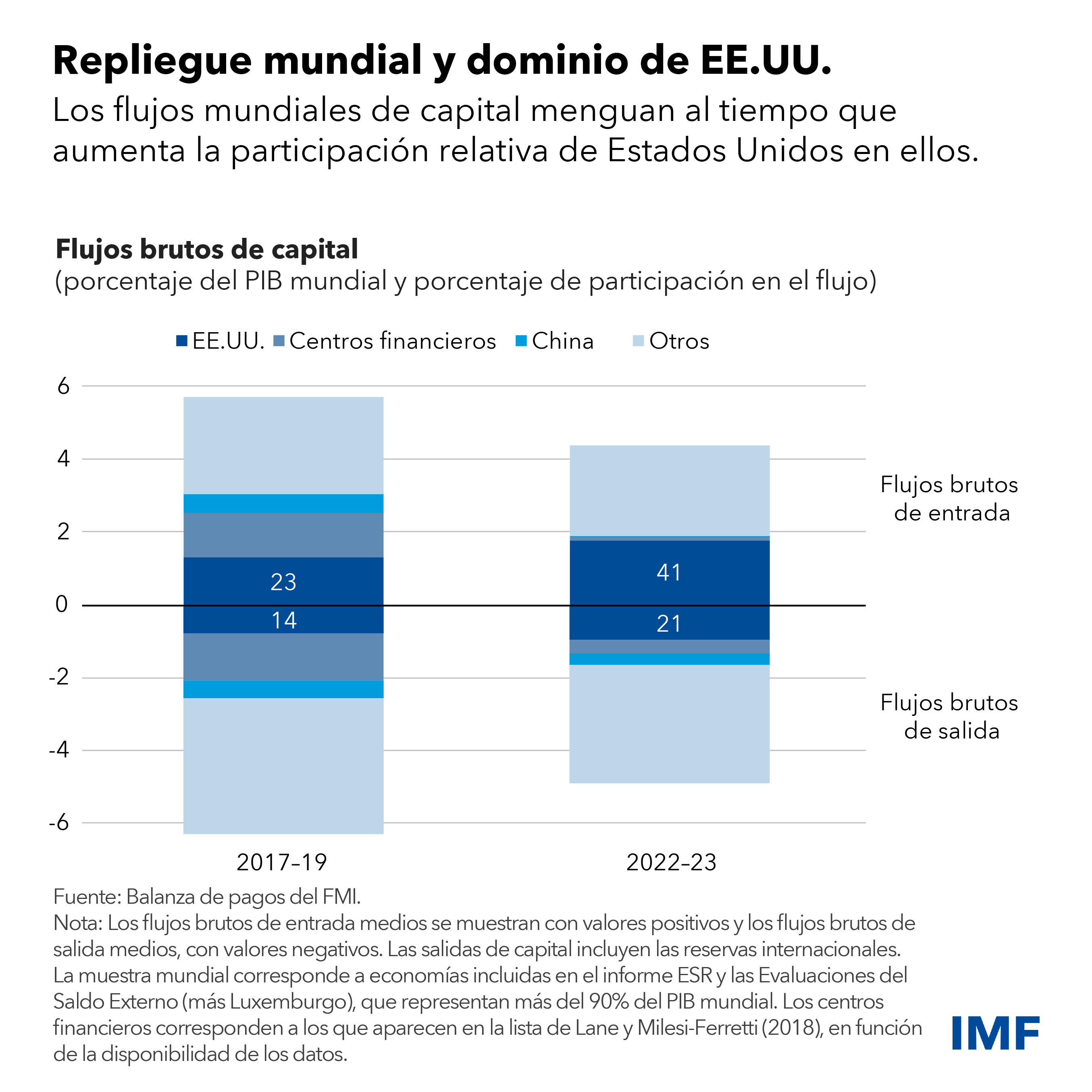 Esta contracción oculta diferencias significativas entre los países. Estados Unidos acaparó el 41% de los flujos brutos de entrada mundiales, casi el doble de la participación relativa del 23% registrada en 2017-19. En cuanto a los flujos brutos de salida desde Estados Unidos, también han aumentado de manera similar, pasando de suponer el 14% de los flujos netos de salida mundiales a situarse en el 21%. Por otro lado, los flujos brutos mundiales dirigidos hacia China o procedentes de China se redujeron considerablemente durante ese período y se produjo un retroceso todavía más drástico en los flujos brutos de los centros financieros.