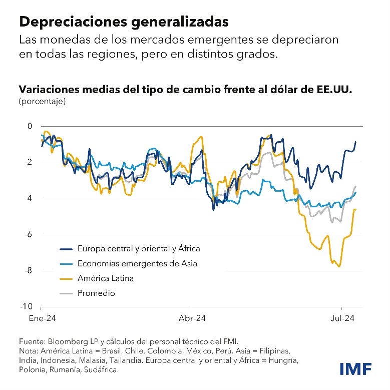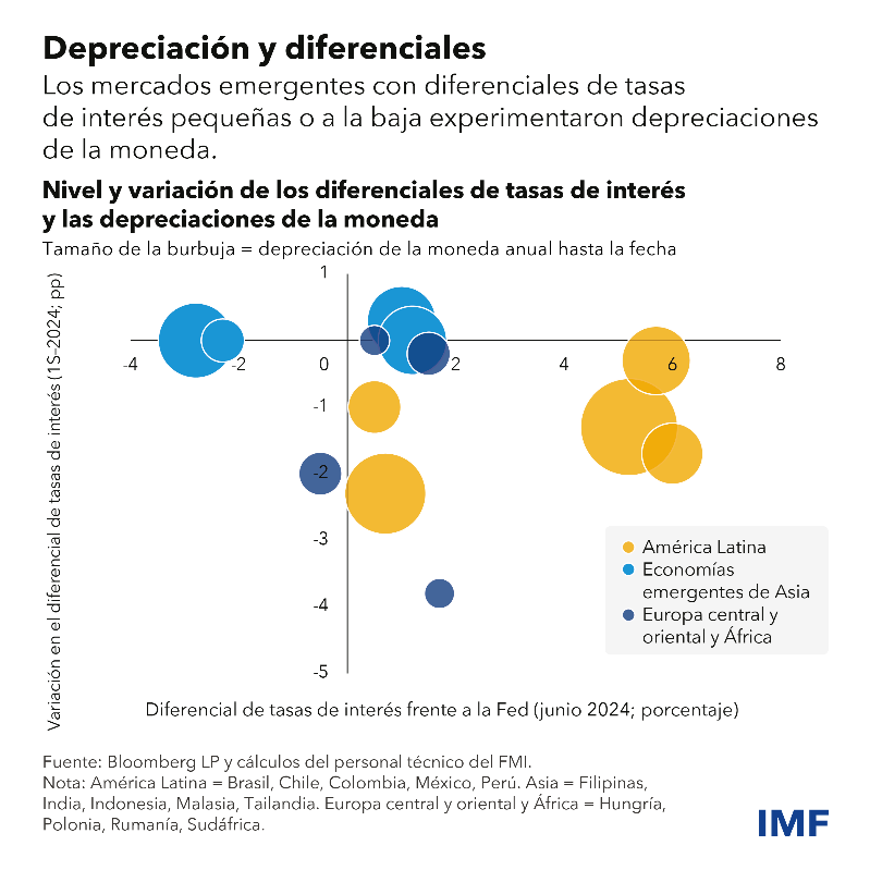Un factor clave que determina los tipos de cambio es la diferencia entre las tasas de interés de un país en concreto y las de Estados Unidos, que son las que se toman como referencia en los mercados mundiales de capitales. A principios de este año, los inversionistas esperaban que la Reserva Federal recortara las tasas de interés significativamente, con lo que habrían aumentado o por lo menos se habrían mantenido los diferenciales con las tasas de interés en los mercados emergentes. En cambio, al mostrarse la economía de Estados Unidos más fuerte de lo previsto y con la inflación aún a cierta distancia del nivel fijado como meta por la Fed, las expectativas de recortes de las tasas de interés en Estados Unidos se han ido desvaneciendo a lo largo del año, y el dólar estadounidense se ha apreciado. En consecuencia, los diferenciales de las tasas de interés de los principales mercados emergentes respecto de Estados Unidos se han reducido.