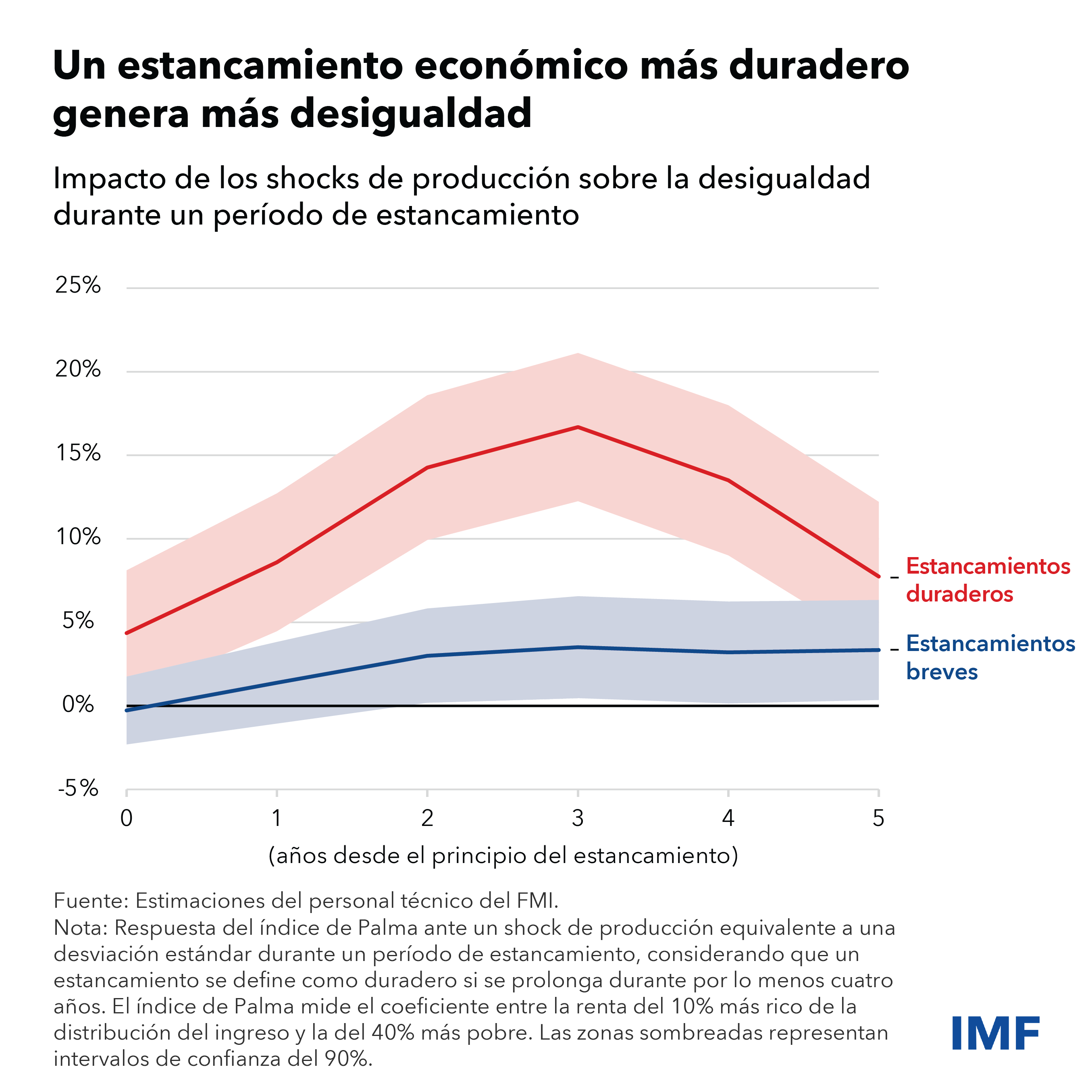 Un nuevo estudio del FMI sugiere que los períodos de estancamiento que duran cuatro años o más tienden a provocar, dentro de los países, un aumento de la desigualdad de ingresos que roza el 20%, lo que supera considerablemente el aumento debido a una recesión manifiesta.
