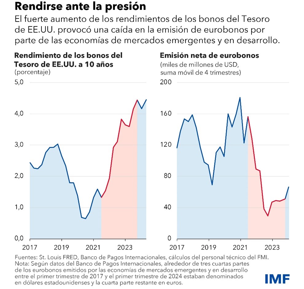 Este año, las condiciones de las tasas de interés mundiales han comenzado a ser más favorables para los prestatarios, a medida que los bancos centrales de varias de las principales economías avanzadas han comenzado a flexibilizar su política monetaria. Esta evolución contribuyó a la recuperación de la emisión de eurobonos, hasta los USD 40.000 millones en el primer trimestre de 2024, con la vuelta al mercado de países como Benin y Côte d’Ivoire. El inicio de un ciclo de flexibilización de la Reserva Federal puede respaldar un nuevo repunte en la emisión de eurobonos y una reactivación más amplia de los flujos de capital hacia las economías de mercados emergentes y en desarrollo.