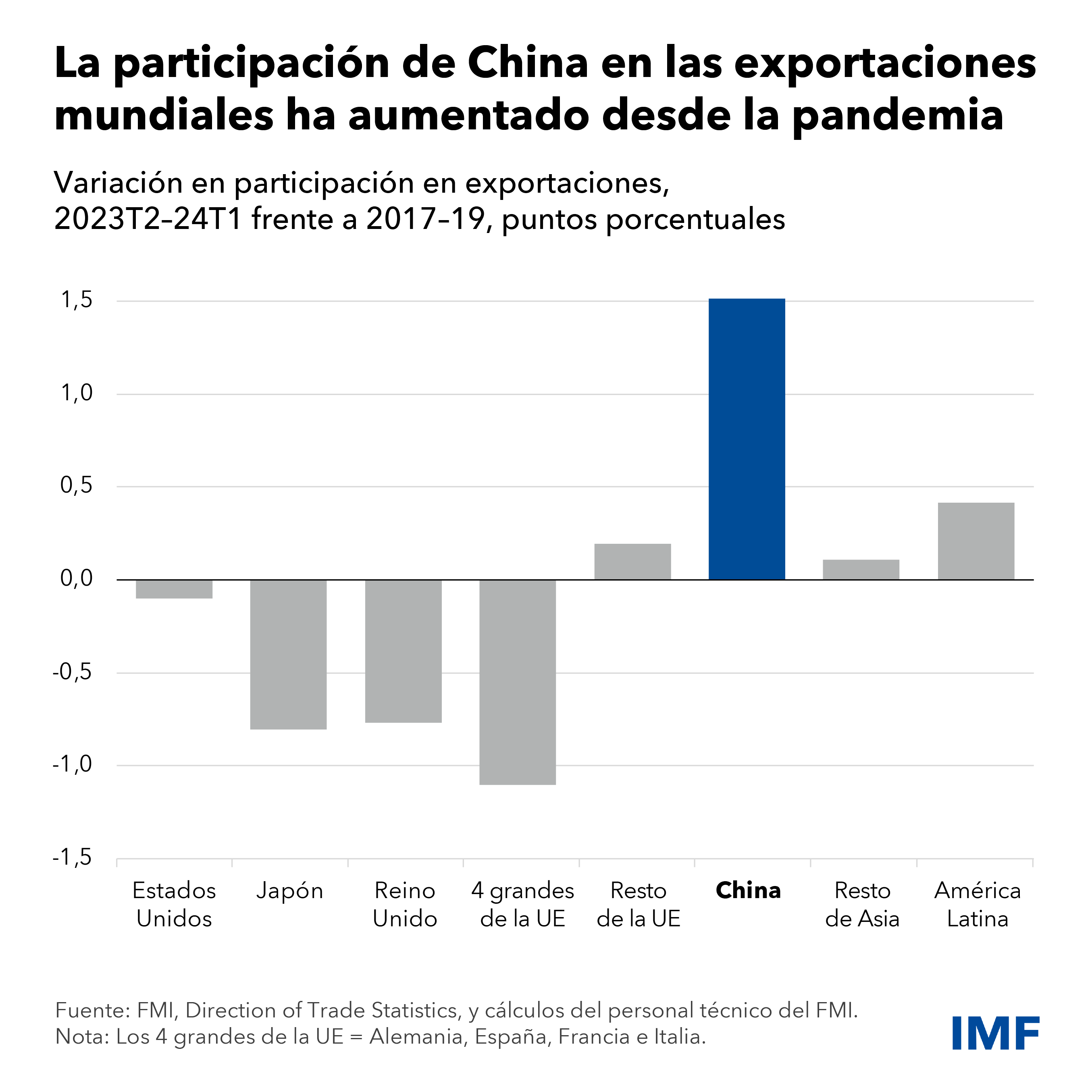 El aumento del superávit comercial de China y el déficit comercial de Estados Unidos desde la pandemia han reavivado la preocupación por los desequilibrios mundiales y estimulado un intenso debate sobre sus causas y consecuencias. Cada vez preocupa más que el superávit externo de China se deba a medidas de política industrial concebidas para estimular las exportaciones y favorecer el crecimiento económico ante una demanda interna débil. Algunos temen que el consiguiente exceso de capacidad pueda dar lugar a un "shock 2.0 de China": un aumento de las exportaciones que desplazaría a los trabajadores y perjudicaría a la actividad industrial en otros lugares.