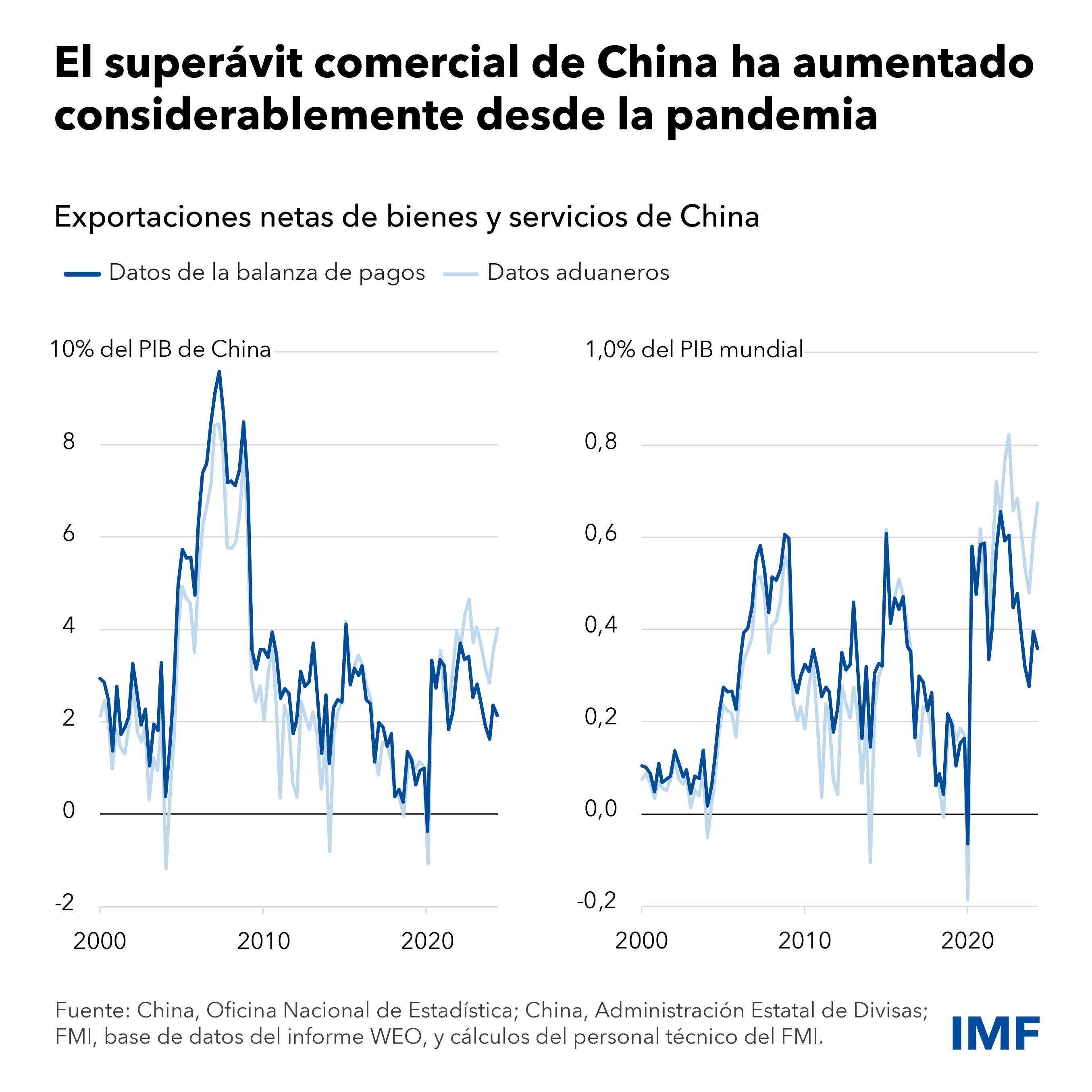 El superávit comercial como proporción de la producción económica es menor que durante el "shock de China" de la década de 2000 (en su nivel máximo, en torno al 10 % del PIB de China). No obstante, ahora China representa una parte sustancialmente mayor de la economía mundial, hasta el punto de que, aunque su superávit comercial es menor en relación con su economía, como porcentaje de la producción mundial, apenas ha variado a lo largo del tiempo. Por consiguiente, los efectos de contagio de los acontecimientos comerciales en China siguen teniendo un impacto considerable en el resto del mundo.