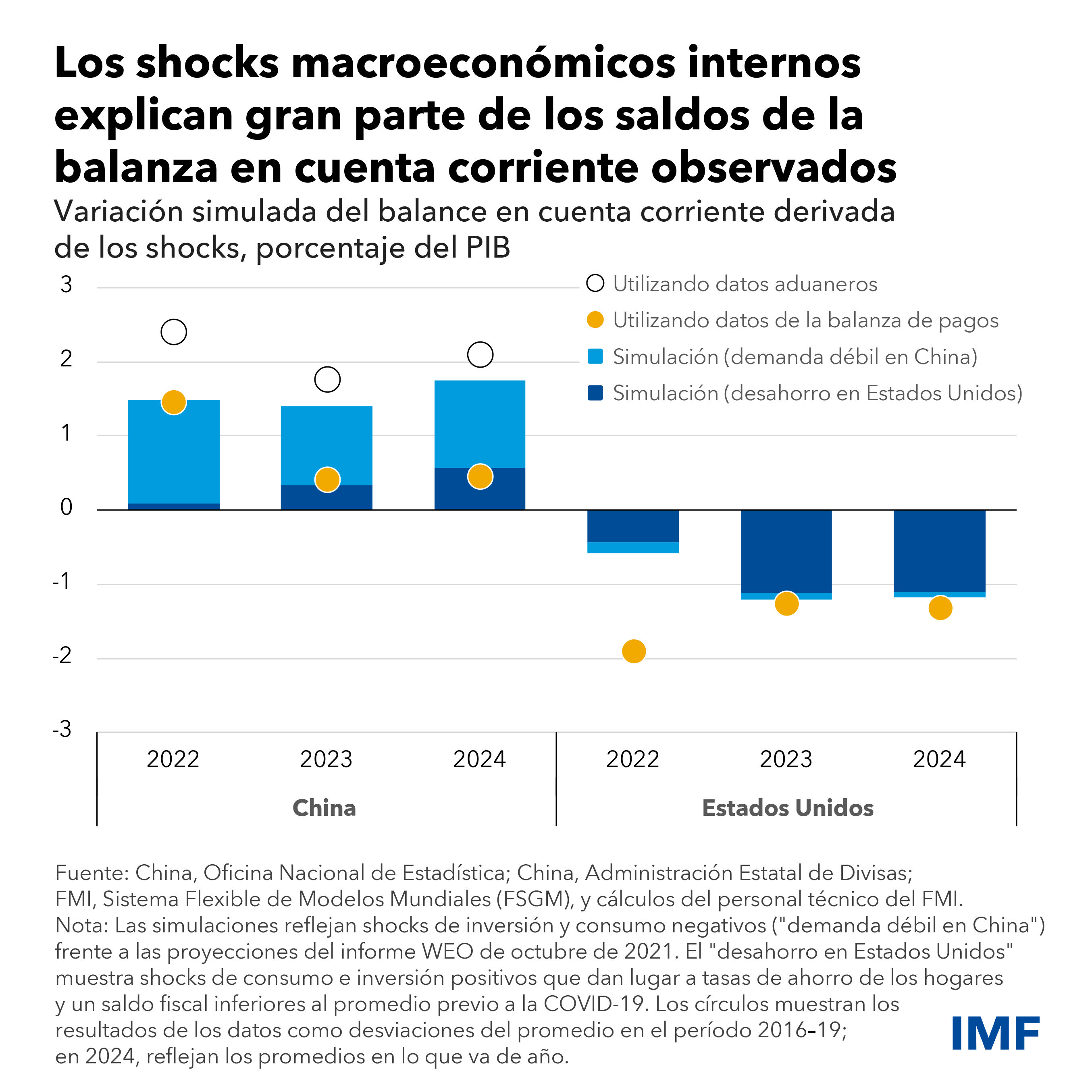 Nuestro análisis (simulaciones estilizadas que aplican el modelo del Grupo de los Veinte, o G20, del FMI) se muestra que los factores macroeconómicos están impulsando estos acontecimientos externos. Entre estos factores, figuran los shocks negativos de demanda interna en China, debido a la desaceleración en el mercado inmobiliario y la escasa confianza de los hogares, así como a un shock de desahorro en Estados Unidos que responde al elevado gasto público y privado.