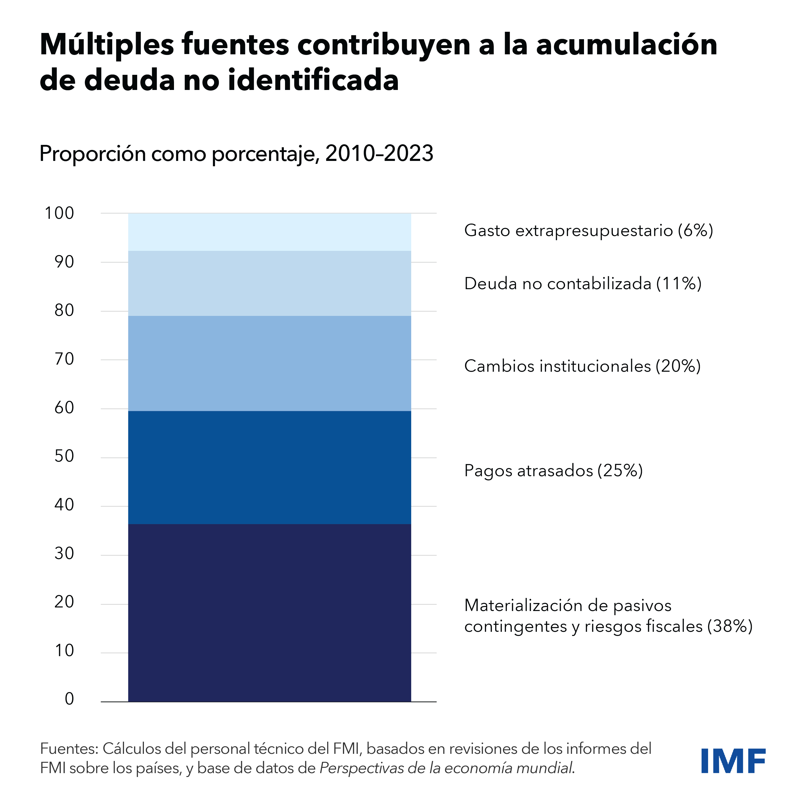 La importante deuda no identificada es otro de los motivos por los que la deuda pública puede resultar considerablemente más alta de lo previsto. Un análisis de más de 30 países detectó que el 40% de la deuda no identificada procede de pasivos contingentes y de riesgos fiscales que afrontan los gobiernos, la mayoría relacionados con pérdidas de empresas estatales. Históricamente, la deuda no identificada ha sido abultada —ha oscilado entre el 1% y el 1,5% del PIB en promedio—, y aumenta de manera pronunciada durante períodos de tensión financiera.