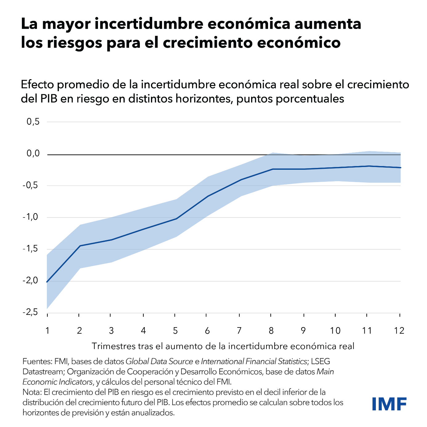 Si los indicadores de la incertidumbre económica subieran como lo hicieron durante la crisis financiera mundial, lo que consideramos el decil inferior de los resultados potenciales de crecimiento económico —también conocido como riesgo de que se materialice un evento de deterioro extremo, o riesgo de cola— descendería 1,2 puntos porcentuales. Esto significa que si el crecimiento proyectado de la economía mundial era del 0,5% en un escenario adverso, la previsión ahora sería de una contracción del 0,7%.