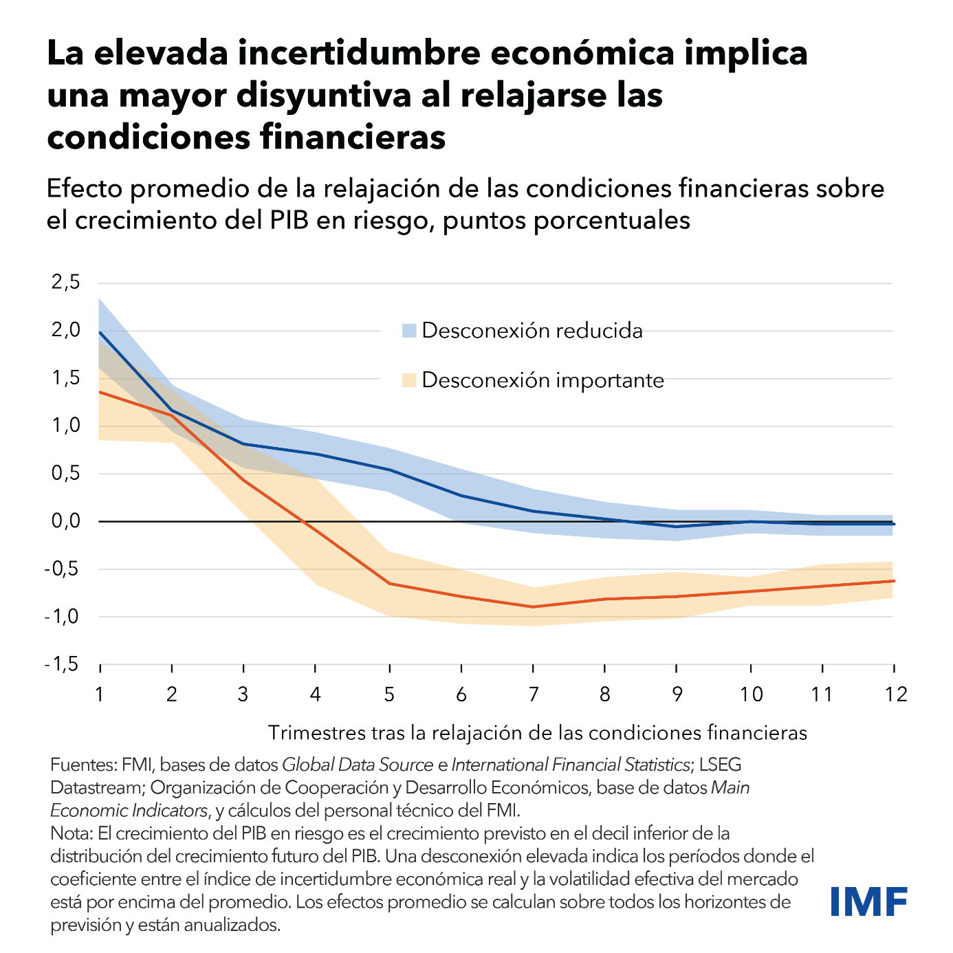 En términos más generales, una elevada incertidumbre económica puede amplificar lo que denominamos la disyuntiva de estabilidad macrofinanciera asociada con unas condiciones financieras laxas. Cuando las condiciones financieras se relajan, las expectativas de crecimiento económico suelen elevarse y los riesgos de deterioro de la economía se reducen el primer año. Esto se debe a factores como el descenso de las tasas de interés, el aumento de las valoraciones de los activos, la reducción de los diferenciales crediticios y la menor volatilidad del mercado bursátil. Sin embargo, las condiciones financieras laxas pueden aumentar las vulnerabilidades de la deuda, lo que agrava los riesgos de que el crecimiento económico se deteriore más adelante.