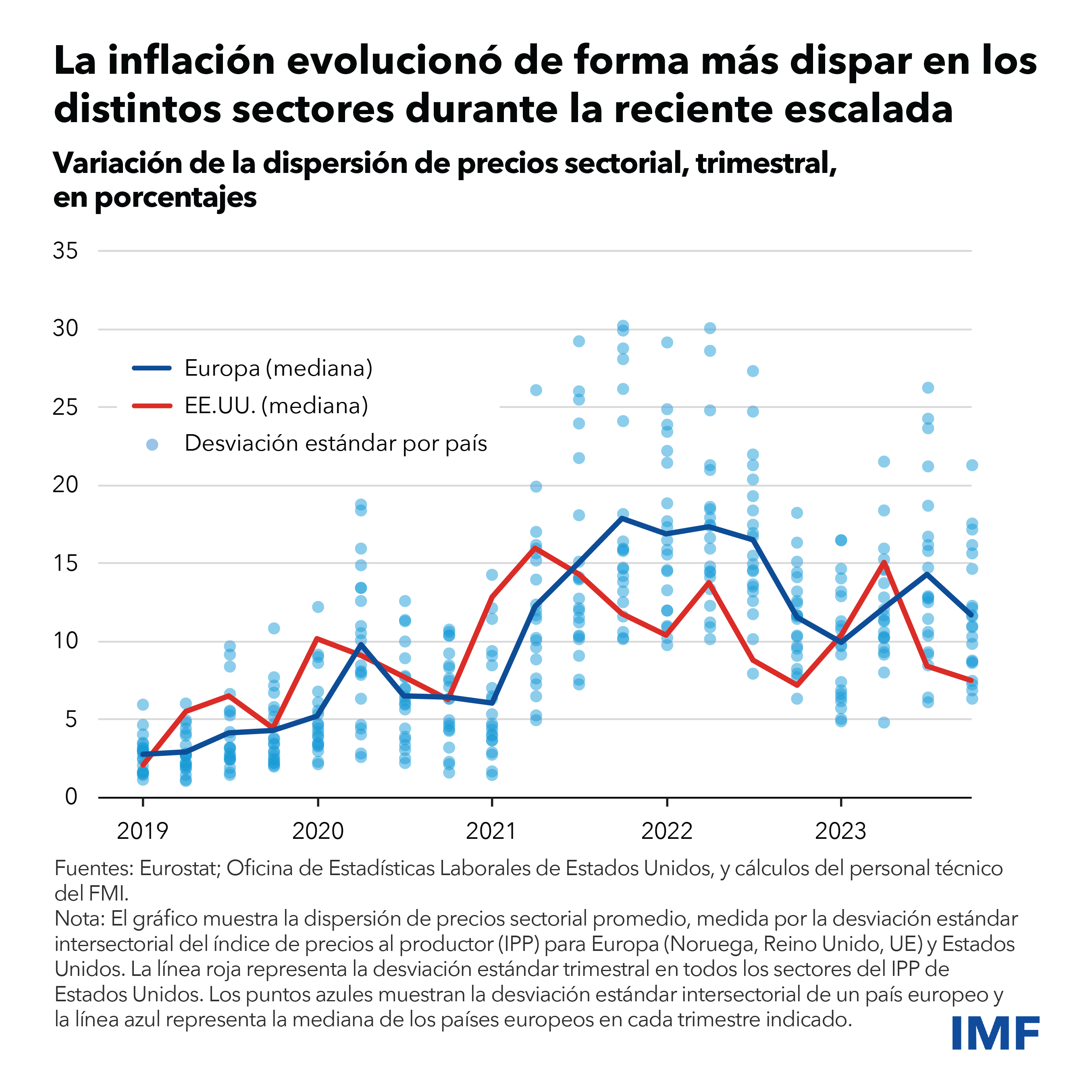 Para comprender la reciente escalada mundial de la inflación, el análisis ha de ir más allá de los agregados macroeconómicos tradicionales. Nuestro modelo muestra cómo los fuertes repuntes de la inflación en sectores concretos se integraron en la inflación subyacente, un indicador menos volátil que excluye los alimentos y la energía. Para nuestro análisis resulta clave la interacción entre una demanda pujante y los cuellos de botella y shocks que se produjeron en sectores concretos. Estos causaron fuertes cambios de los precios relativos que dieron lugar a una dispersión inusual de los precios.