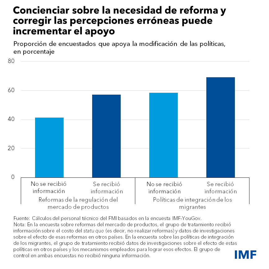 • Información: La comunicación eficaz es uno de los ejes de una estrategia de reforma eficaz, y es algo que no se ha de reducir a la promoción de las reformas. Las autoridades tienen que explicar de manera convincente la necesidad de cambio, los efectos esperados y la forma de conseguirlos. Se observa que el respaldo público es mayor cuando se proporciona información clara e imparcial que corrige las percepciones equivocadas. Por ejemplo, según nuestra encuesta, esto llevó a cambiar de opinión a más del 40% de las personas que se oponían a las políticas de integración de los inmigrantes.