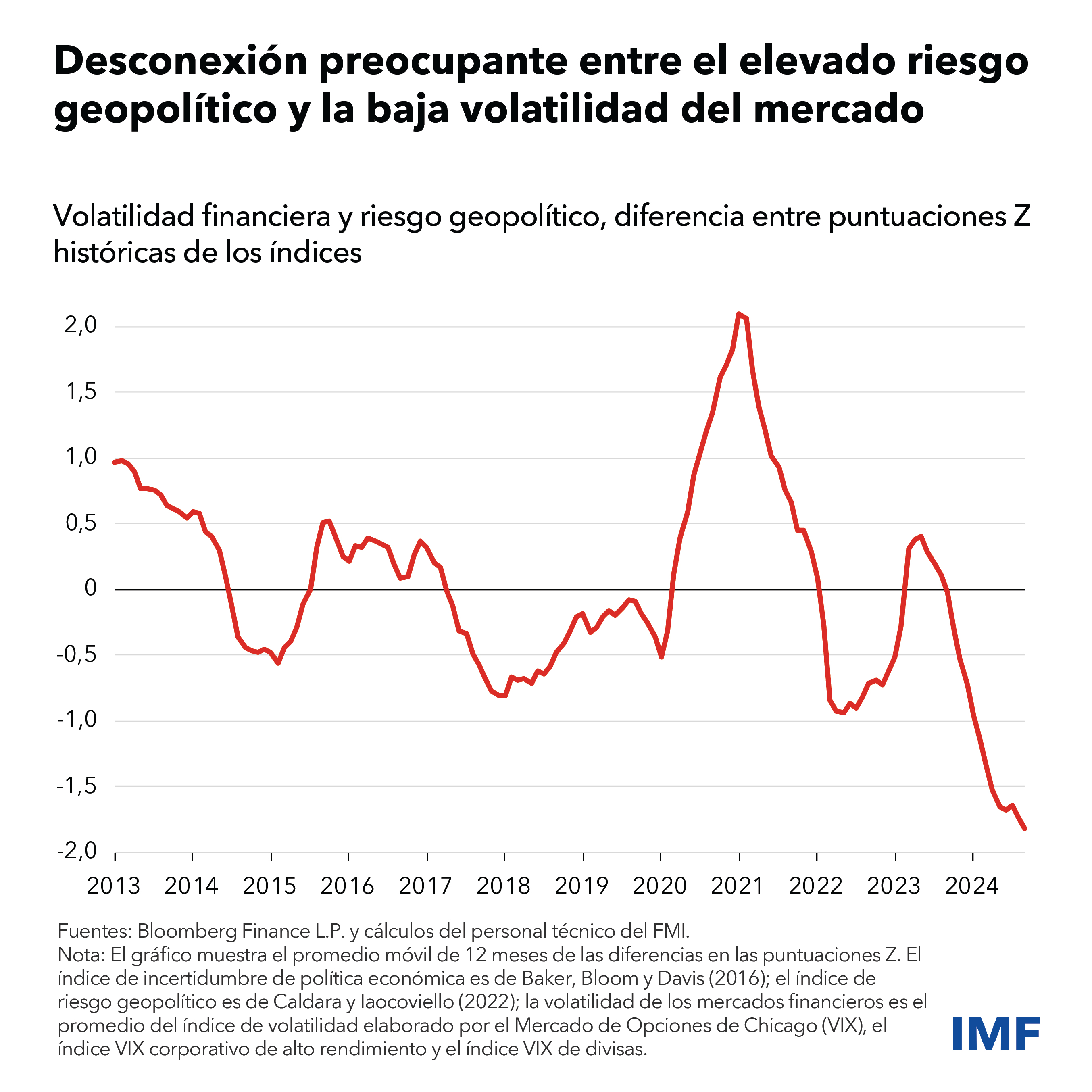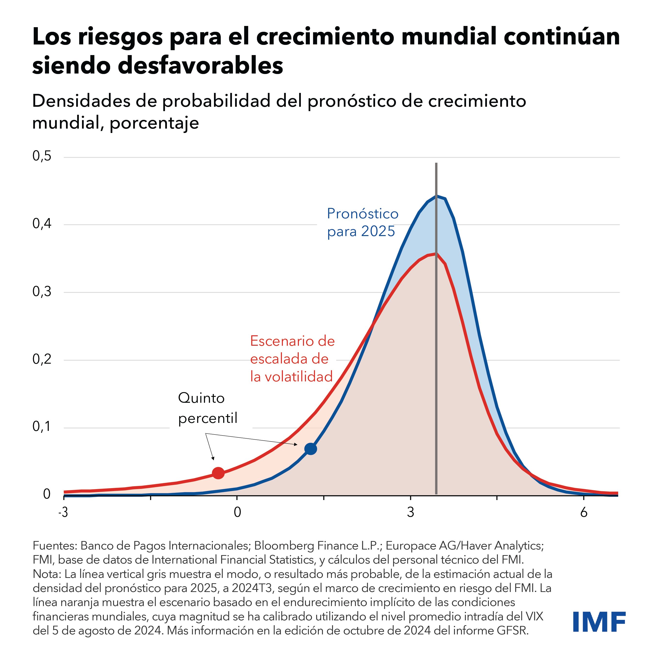 Con todo, las autoridades deben permanecer alerta. Dada la importante desconexión entre la incertidumbre, los riesgos geopolíticos y la volatilidad de los mercados financieros, las escaladas de la volatilidad serán probablemente más frecuentes. En un escenario en que las condiciones financieras se endurecen de forma similar a lo que sucedió el 5 de agosto —y se mantienen en ese nivel durante todo un trimestre—, la probabilidad de que el crecimiento de 2025 caiga por debajo de la proyección de referencia del informe WEO se incrementa hasta aproximadamente el 75%, un nivel comparable al máximo de la crisis de la COVID, lo que hace pensar que los riesgos de deterioro podrían aumentar sustancialmente cuando la volatilidad se sitúe en un nivel más acorde con el grado de incertidumbre.