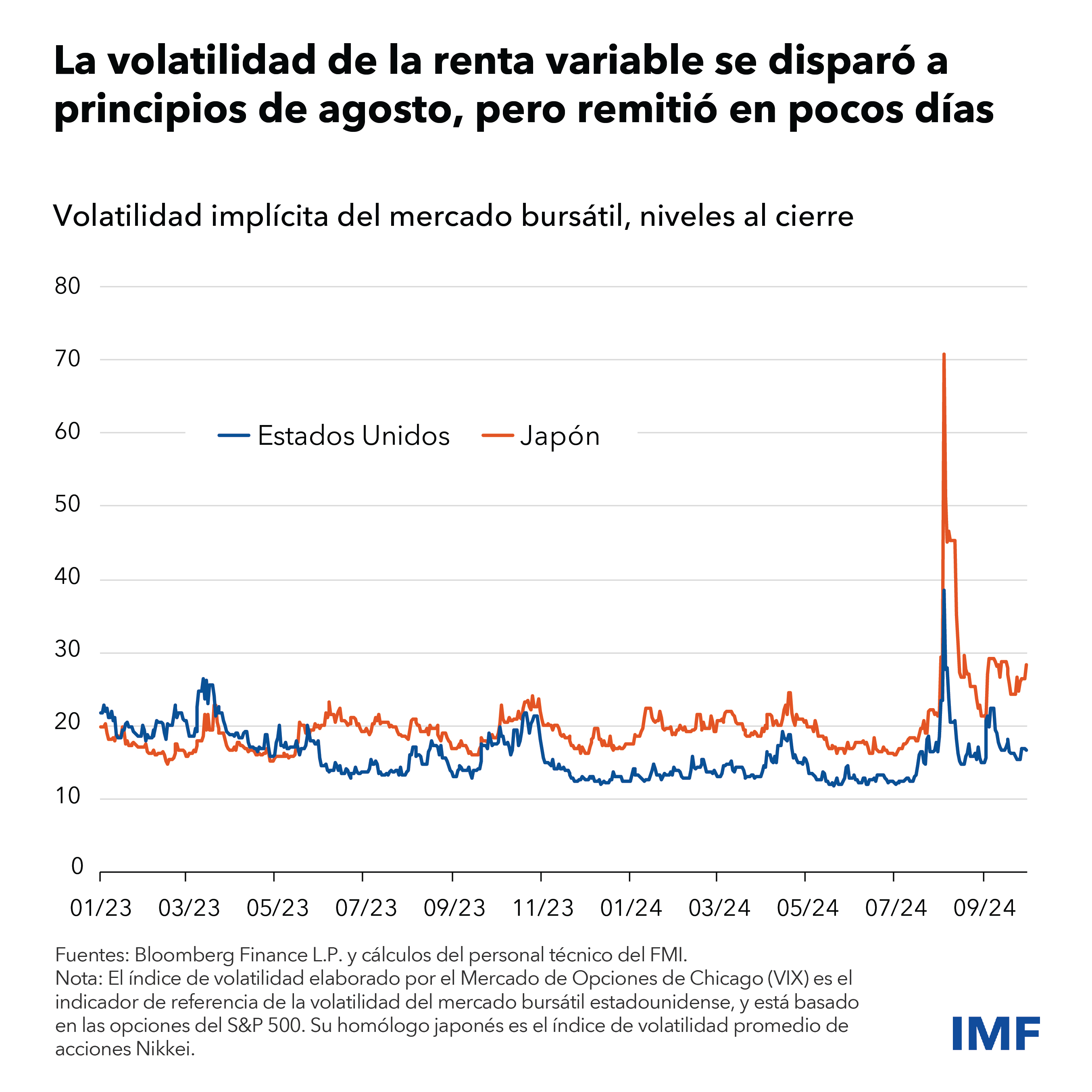 También hubo otros factores que agravaron la venta masiva: los inversionistas comenzaron a comprar opciones de venta de acciones como protección frente a las pérdidas, lo que provocó un aumento de la volatilidad de las acciones, en especial en Japón y Estados Unidos. Por su parte, la escalada de la volatilidad activó límites de riesgo para algunos inversionistas, como fondos de inversión libre y operadores oportunistas, dando lugar a nuevas ventas masivas. Ciertamente, las presiones del mercado resultaron ser temporales y no amenazaron la estabilidad financiera. Pero los bruscos movimientos de los inversionistas hacia la cobertura de riesgos mostraron claramente que los cambios en la actitud del mercado pueden amplificar con rapidez la volatilidad.